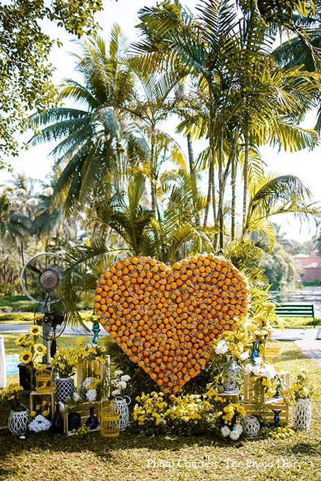 Planners Zain Rais & Saloni Sanghvi shares, “Since this event was an ice breaker of sorts, we decided to give the welcome lunch a very fresh look with fruity elements in the decor. The couple opted for a citrusy theme which consisted of a pretty heart-shaped backdrop crafted out of oranges. This installation also doubled up as a perfect spot for everyone to take pictures! As the couple entered the venue, they were welcomed by the beats of the dhol and bhangra dancers and soon, everyone could be seen shaking a leg!”