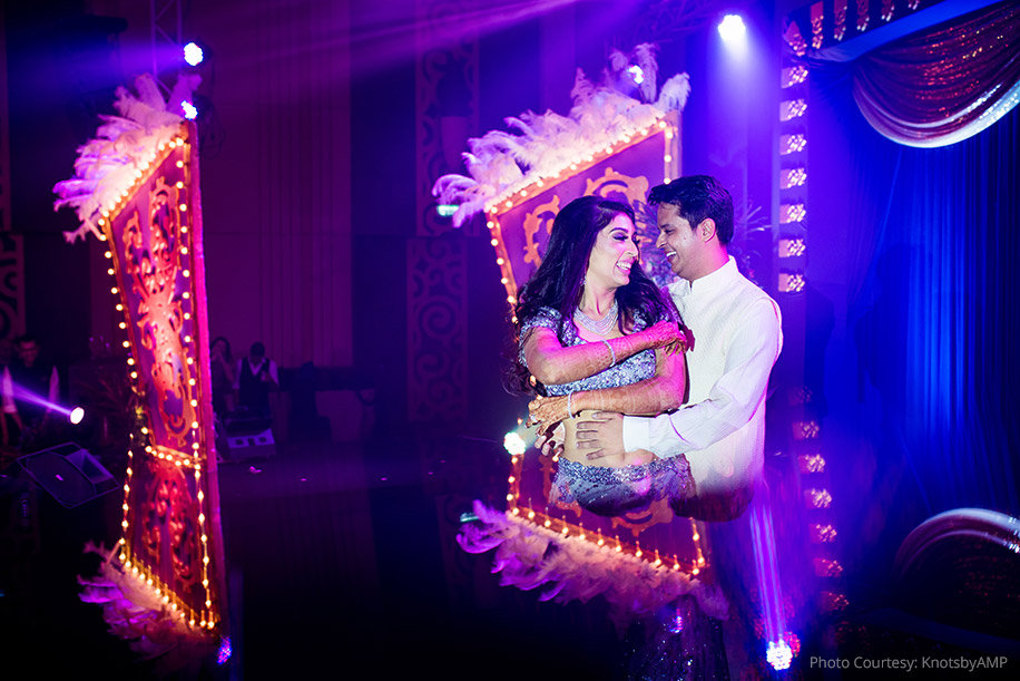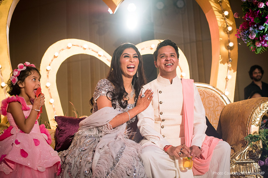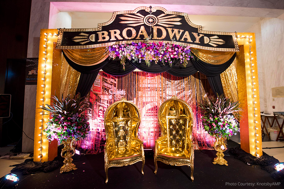 The Broadway-themed sangeet added classic glamour to Neha and Shubham’s wedding celebrations. A dramatic canopy inscribed with ‘Broadway’ and two golden chairs made for a cool photo booth. Shimmering drapes, feathers, and lights came together to add a touch of flamboyance and bring the theme alive. Neha wore a blingy lehenga by Nadine Dhody, and Shubham wore a cream dhoti kurta with a bandi jacket and pink dupatta by Karan Tanna that was bought from Anahita in Hyderabad. There was flip-flop footwear arranged for the ladies if they wanted to change out of their high heels and dance the night away.