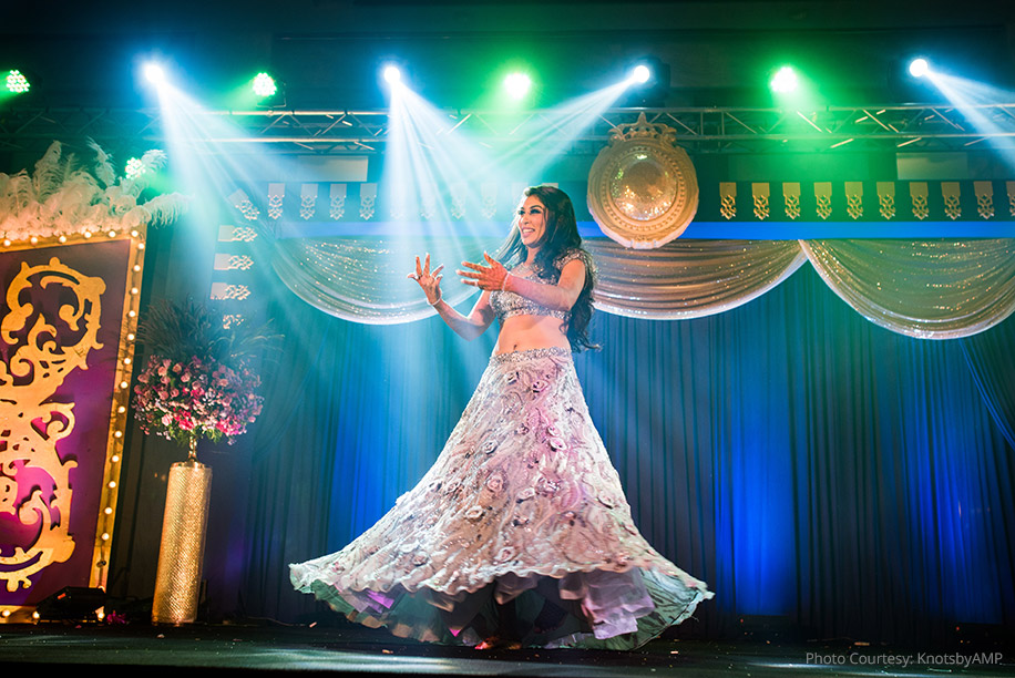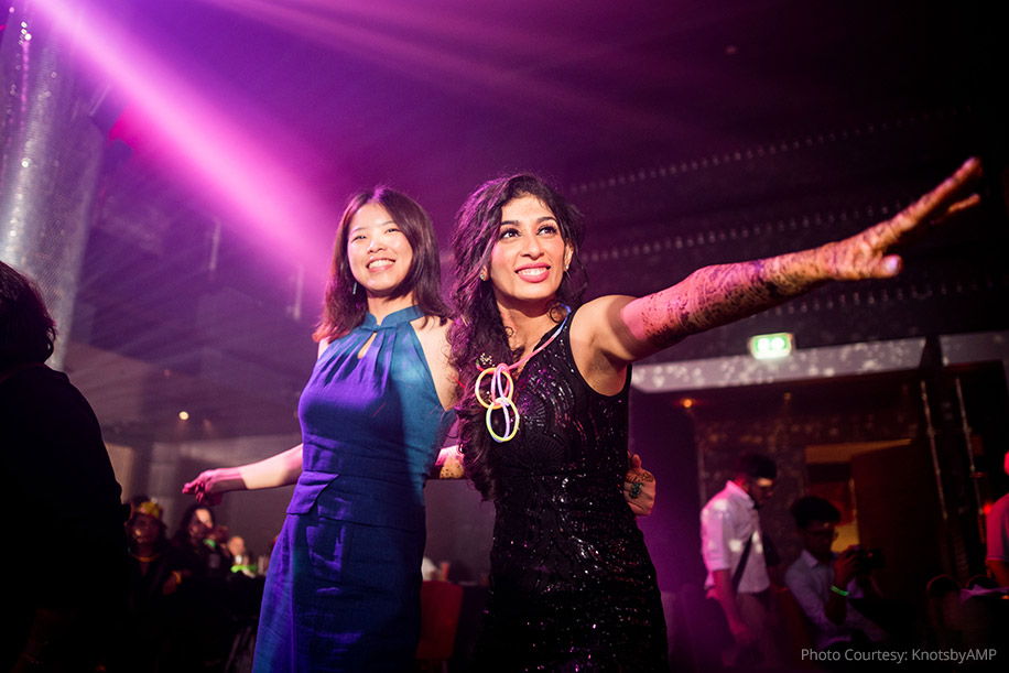 After the mehndi, the wedding party shifted to an indoor venue so that the party could go on until wee hours without disturbing anyone else. The decor for this event was inspired by Hong Kong, and the color scheme was black and red. Neha wore a glamorous black maxi dress.