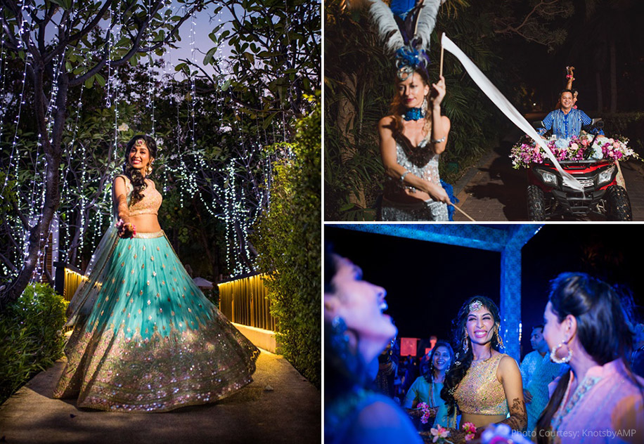 Blue and white ruled their Santorini-themed mehndi. Cabanas draped in the color of the sky dotted the venue and floral arrangements added to the overall charm. Keeping in line with the color palette, Neha wore a blue Tamanna Punjabi Kapoor lehenga, and Shubham matched her look in his blue outfit designed by Gagan Oberoi which he bought from Anahita in Hyderabad. The bride and the groom made a dramatic entry to the event in an All-Terrain Vehicle which impressed their guests.
