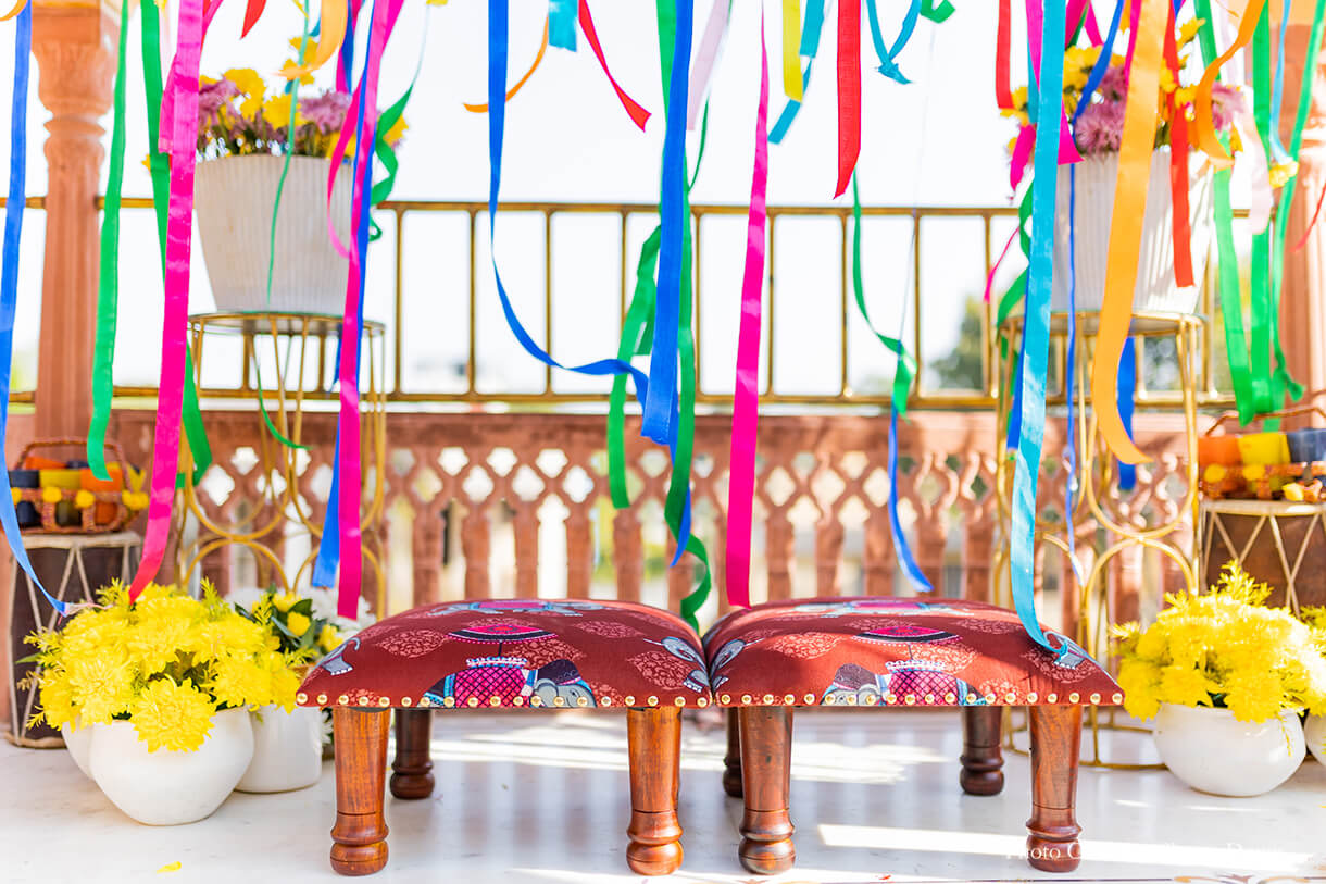 Infusing the sunkissed marigold decor with truckloads of color and fun, the Haldi was a vibrant rooftop affair under the frolicking winter sun. Full of whimsical elements like ribbons, muddas, umbrellas, a flower station, and a perfume bar, the occasion saw a fun roast of the bride and groom followed by the most fun-jabi haldi and chooda ceremony.