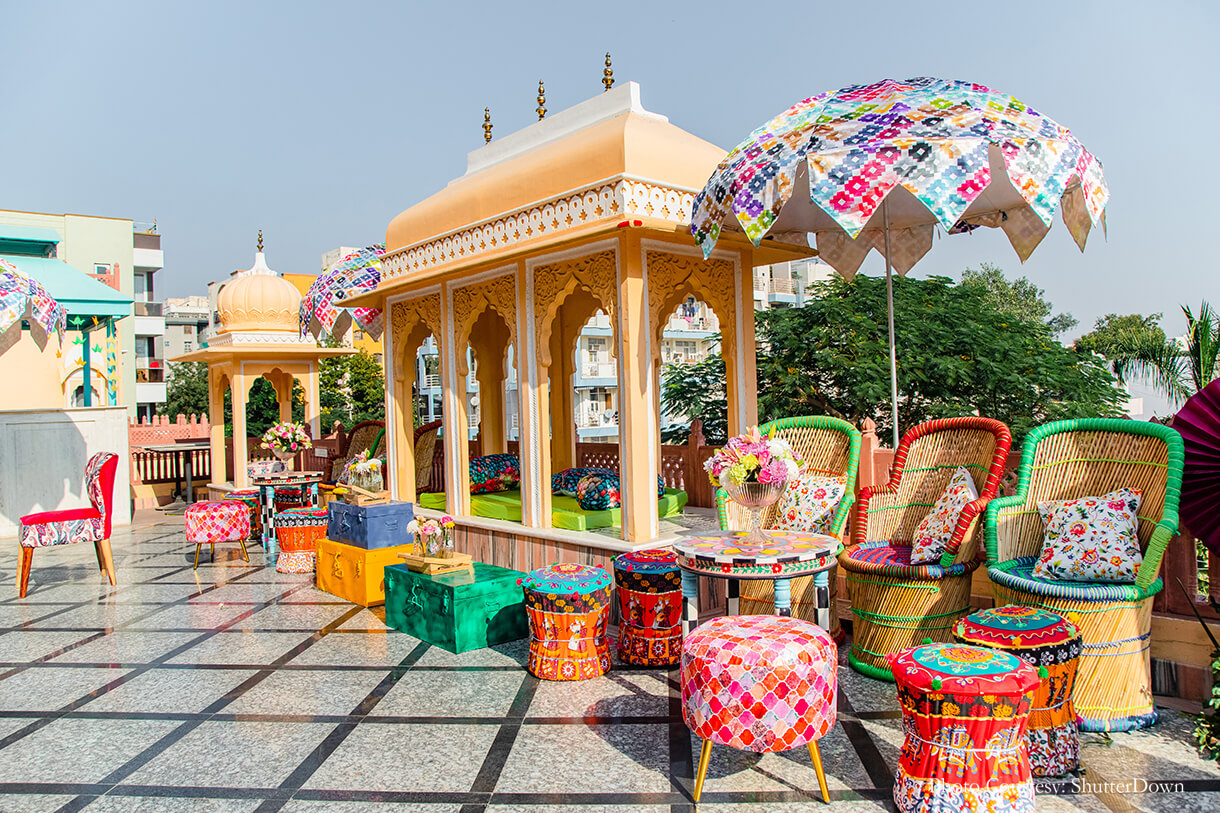 Inspired by candle-light dinners, the sundowner wedding was a romantic affair with a floating Mandap on a pool that was flanked by blooms and candle votives. Cozy sofas, fairy lights, hanging baskets of red flowers, petal cones, and more added to the charm of the occasion. The wedding saw the most graceful, fun entries by the bride and groom with mirror-themed elements and an orange phoolon ki chadar, while a parrot tarot reader and a marriage advice box kept the guests entertained during pheras.