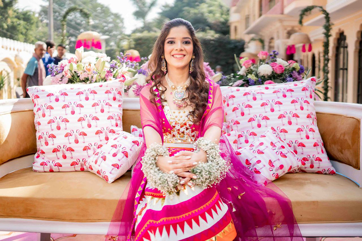 The vibrant colors and lively spirit of Mehndi welcomed the guests to the 2-day celebration with great fervor. Kalbelia dancers, cycle chai wala, henna artists, and more set a riveting tone for the occasion as everyone unwinded, enjoyed, and had their hands decorated with beautiful mehndi designs. Hues of pink and red took over the occasion with flowers, quirky prints, and Rajasthani crafts mixed with modern details like flamingoes, bohemian furniture, dreamcatchers, and more.
