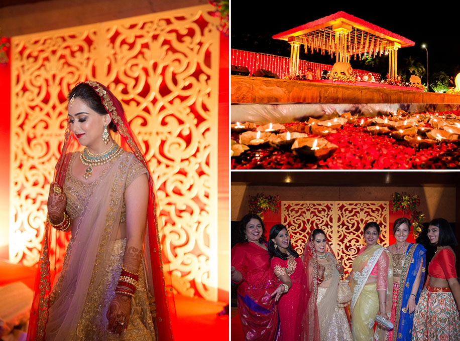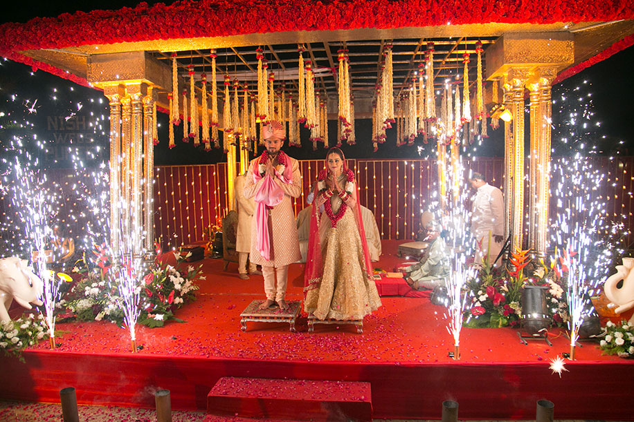 “Our mandap was constructed using lots of golden elements and decorated using red roses. Hundreds of diyas lit up the entire venue and a water body was created in front of the mandap and was enhanced with floating oil lamps. The decor made the location look like a temple. We had our ‘varmala’ (garlands exchange ceremony) first and this was followed by Vedic pheras. For this, a team of 11 priests sat together chanting and translating the chants in Hindi and singing while we proceeded with the rituals. My gold lehenga for this ceremony was from Jade, and I wore a red dupatta which covered my head. I had my husband’s and my name embroidered on this ensemble as I thought it would be fun to make him look for his name on my massive skirt instead of in the mehndi design on my hands. This also made my lehenga unique to me and therefore became a little more special. Puneet went with a sherwani from SVA by Sonam and Paras Modi.”