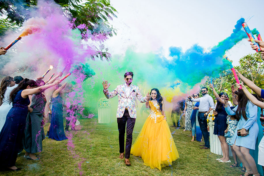 “The stage for our sangeet looked nothing less than that at a concert. It was inspired by the musical instrument, keyboard, and had two designated entry points, one for me and the other for Puneet. What was great was that this feature blended well with the backdrop, so none of the guests expected to see us walk into the venue from there. Later, I surprised Puneet with a solo dance performance that was dedicated to him. My electric blue lehenga was designed by Gaurav Gupta. Puneet went for a jacket and trousers by Shyamal and Bhumika.”