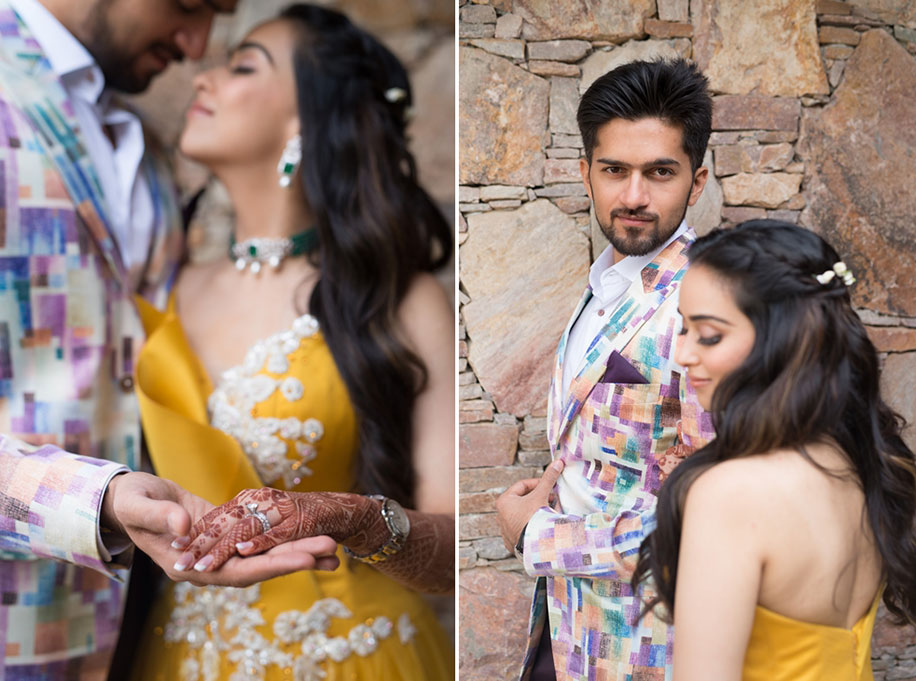 “This was the day when our guests were arriving so we planned a Welcome Lunch for them. On this day too we had mehndi artists for everyone who wasn’t present at the earlier mehndi function a day ago. The venue was done up in gorgeous drapes in shades of orange, peach, corals, neon green and pink. There was a swing with colored tassels and multiple gazebos under which our guests could relax and get mehndi applied.For this function too, I again picked an outfit from Limerick. It was a crop top with one-shoulder cape and a skirt. Puneet wore a Jodhpur jacket with polo pants.”
