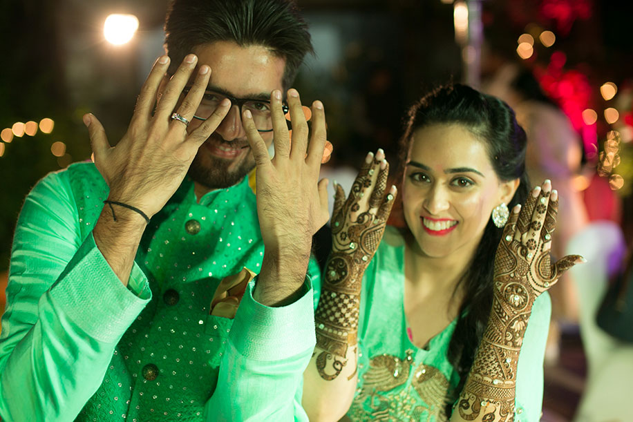 “Our mehndi was a small outdoor affair for about 60 family members who arrived at the destination a day prior to the bigger functions. The decor was colorful with bottles hanging from trees and a beautiful swing that had been set up for the Puneet and I which was decorated with colossal flowers in the shades of white, pink and purple. On this occasion, we played a ‘matchy-matchy’ couple by dressing up in the same shade of green. I wore a crop top and palazzo pants from Limerick in New Delhi while Puneet opted for a kurta and salwar along with a bandi that was made in a tone darker.”