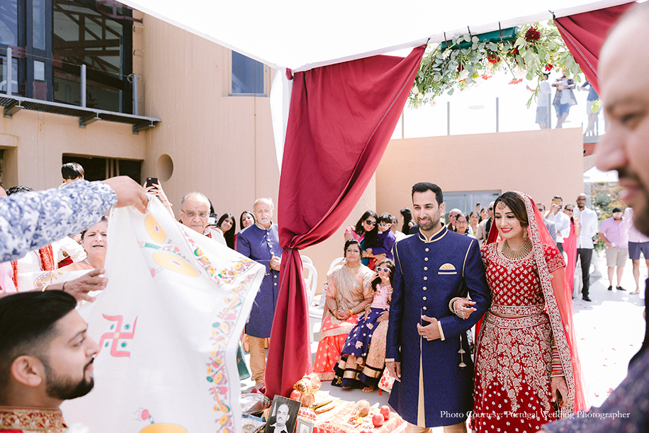 Minimalistic and elegant, this wedding was something else, as the couple kept frills to a minimum and let the scenic beauty of the venue do all the talking. Peppered with white and silver seating arrangements that complemented the beach backdrop, the couple stood out as they went about their rituals in traditional red. Nital glowed in a floral red and gold lehenga which she accessorized with a statement maang tika, necklace, and earrings. Matching with his lovely bride, Varun too opted for a red and gold sherwani which he paired with red velvet shoes.