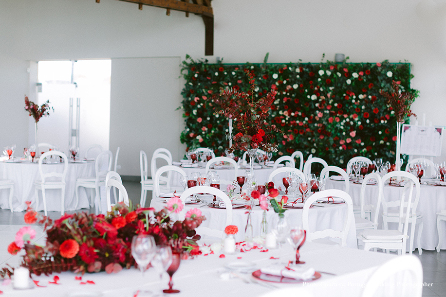 For the reception, the couple cut a customary three-tiered cake and set the dancefloor ablaze with a romantic waltz. Keeping their minimalistic style in mind, the decor was an all-white theme with pops of red on each table.
