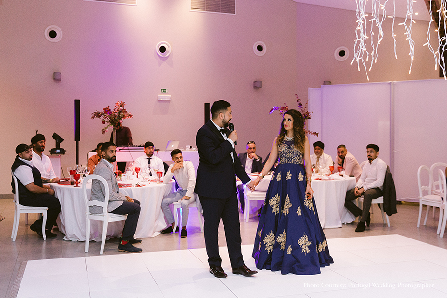The happy bride sported a navy-blue gown with gold embroidery while the groom cut a dashing figure in a classic tuxedo.
