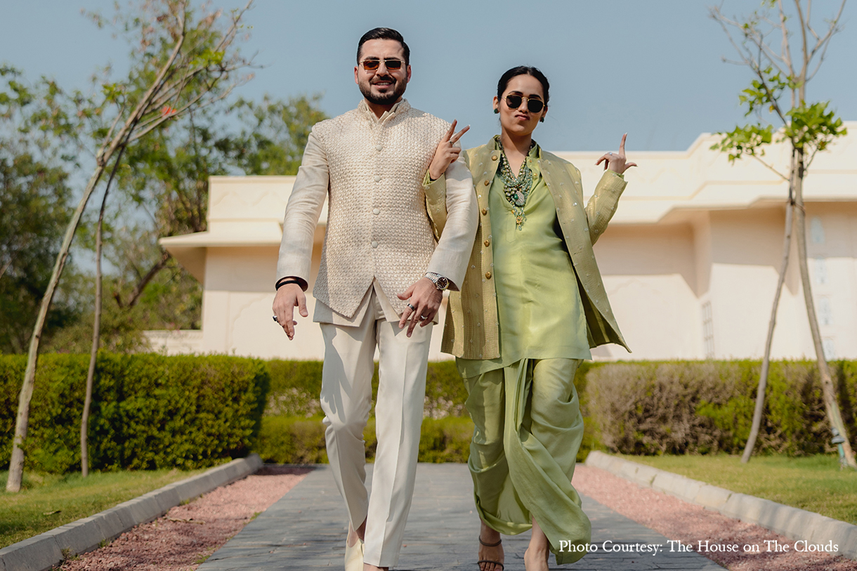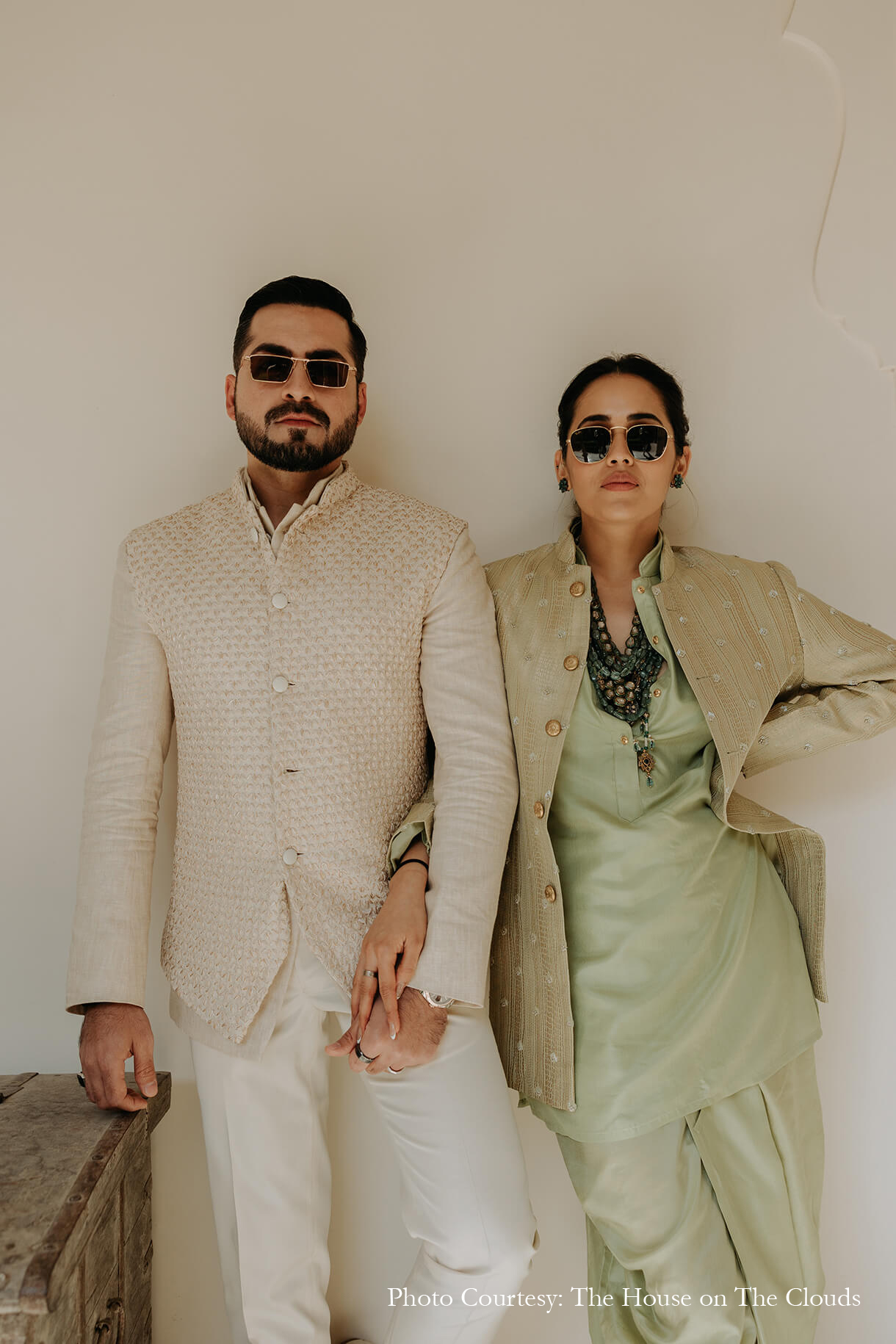 Imagined in a neutral palette, the modern boho decor for the mehndi function incorporated Banarasi textiles in the form of cushions, throws, etc to pay homage to the bride’s Banarasi heritage. Inspired by the couple’s love story, elements like coasters, framed quotes, napkins, table mats, little notes left for the guests, etc. added a lovely personal touch to the occasion. Matching the serene, minimalistic mood of the event, the bride made a statement in a unique mint green bandhgala and dhoti set, while the groom sported an ivory Bandhgala-pant set.