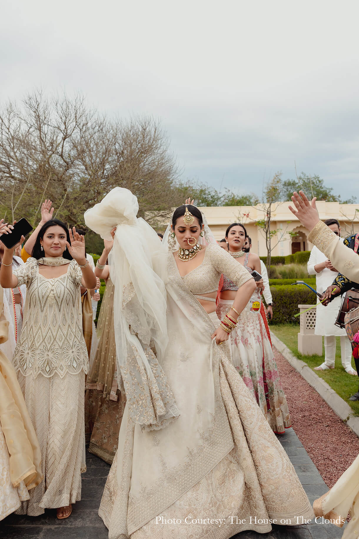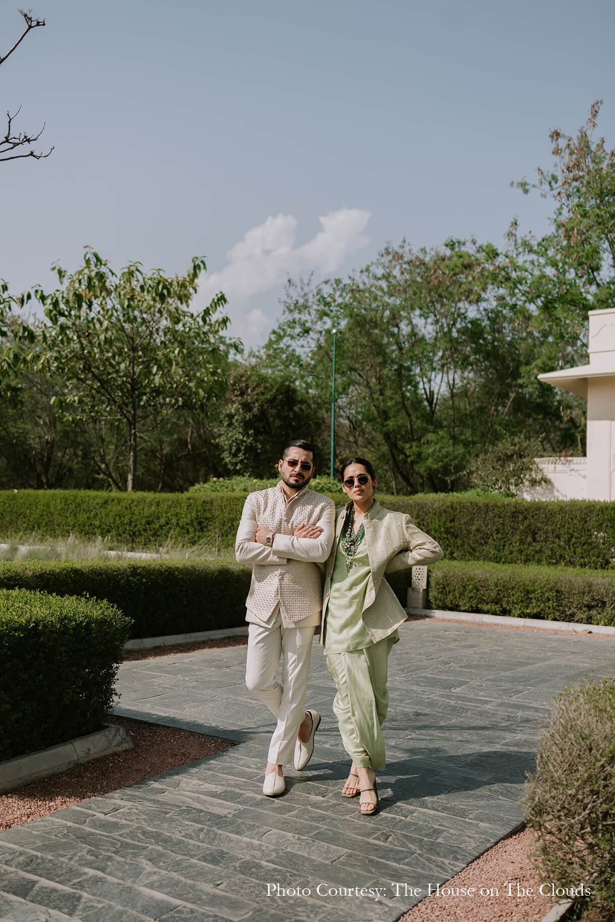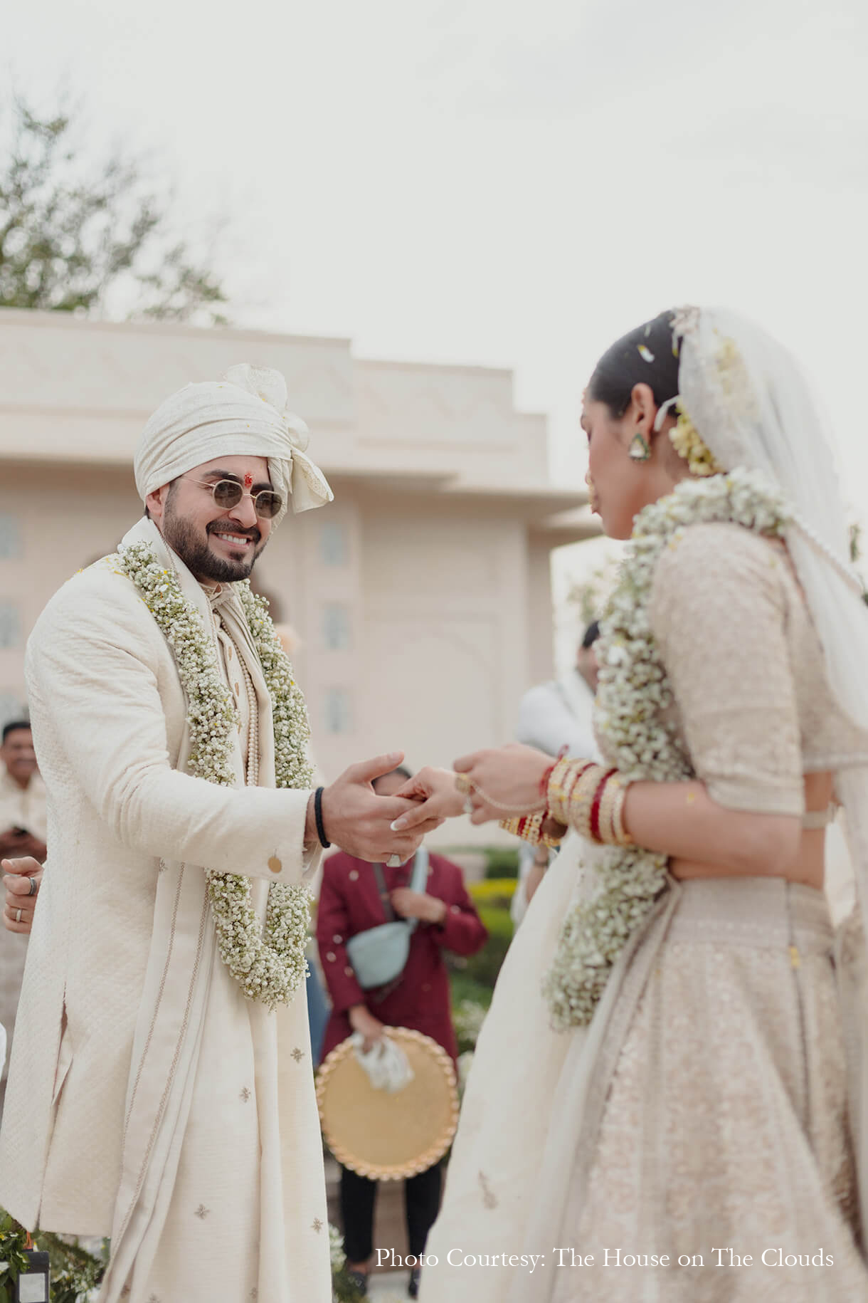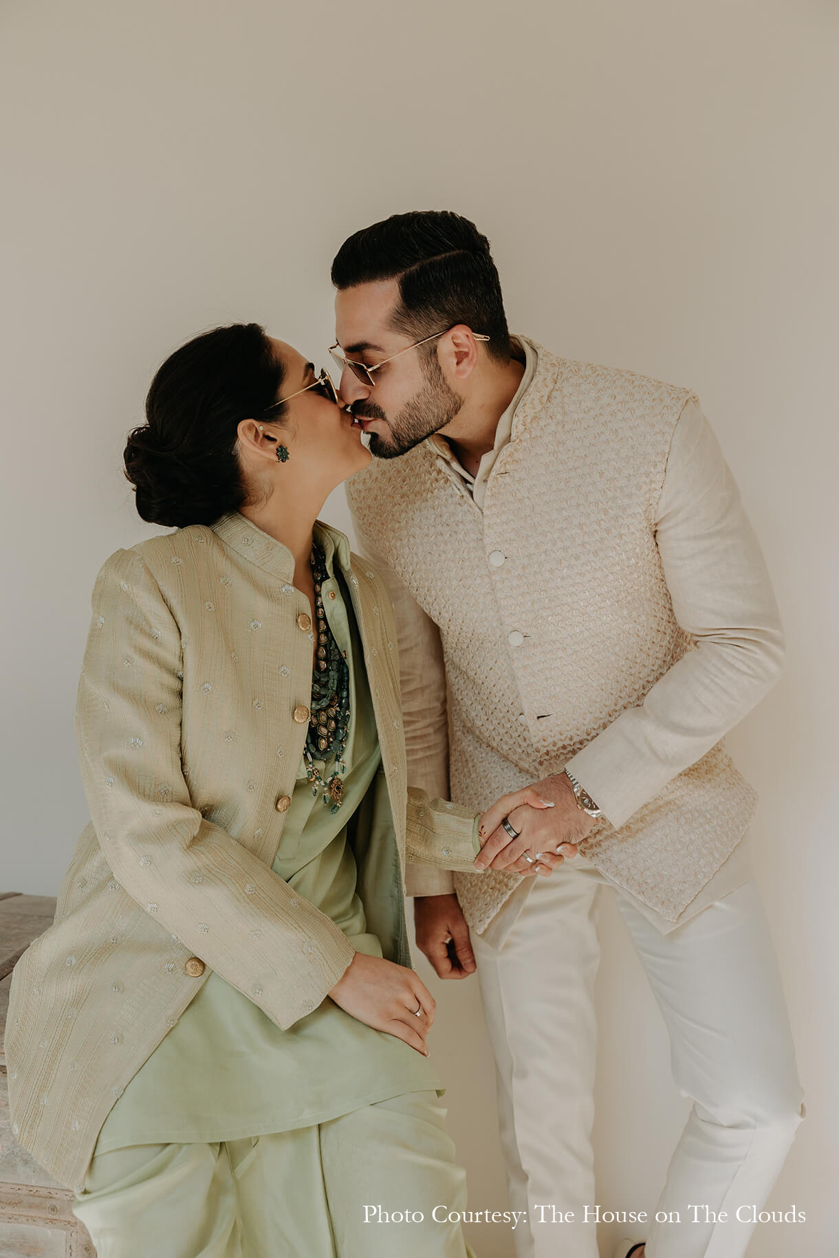 Being a bride working in the creative industry, Palak had a strong aesthetic vision for her destination wedding, with a mood board that was minimal, soulful, and elegant. For their intimate guest list and quaint, close-knit festivities, they chose the idyllic venue of The Oberoi Sukhvilas Spa Resort. The team of The Wedding Square designed and executed everything from the decor to the smallest personalized details of the celebration, while Krayonz Entertainment spearheaded the planning of the entire event, bringing the couple’s vision to life. Every moment of the 2-day festivities was immortalized in breathtaking frames by the celebrated team of The House on the Clouds.