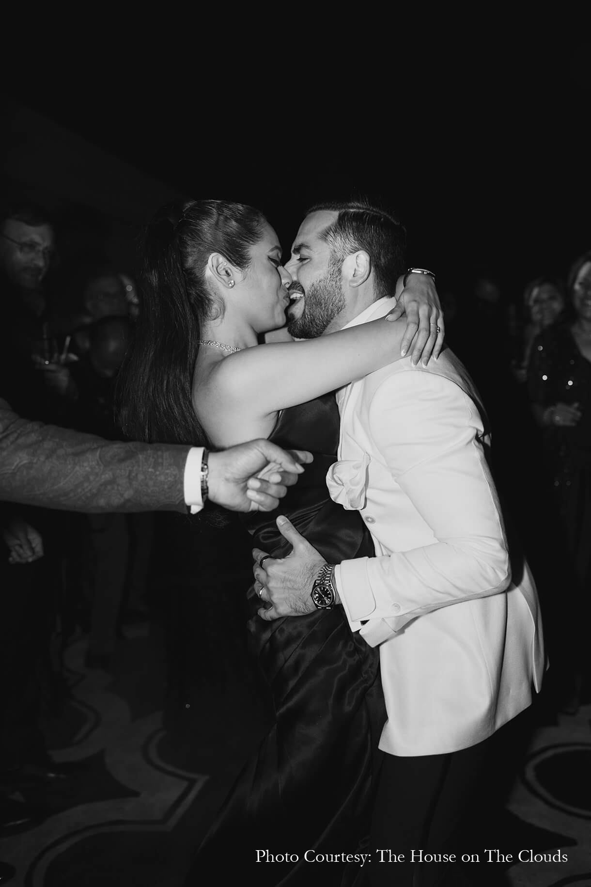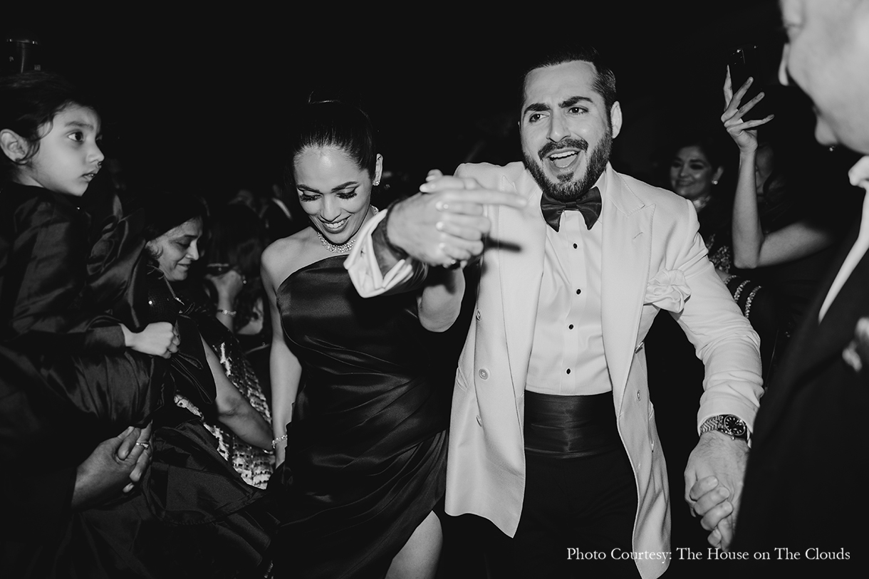 Amping up the glamor with a chic, stylized black tie soirée, the Sangeet was a classy event with black-and-white decor, statement art installations, riveting entertainment, memorable performance, and more. When not busting a move on the dance floor, the guests were invited to spray paint canvases which they could also take back home as a keepsake. The bride flaunted a scintillating black evening gown, while the groom kept it classy with a white tuxedo.