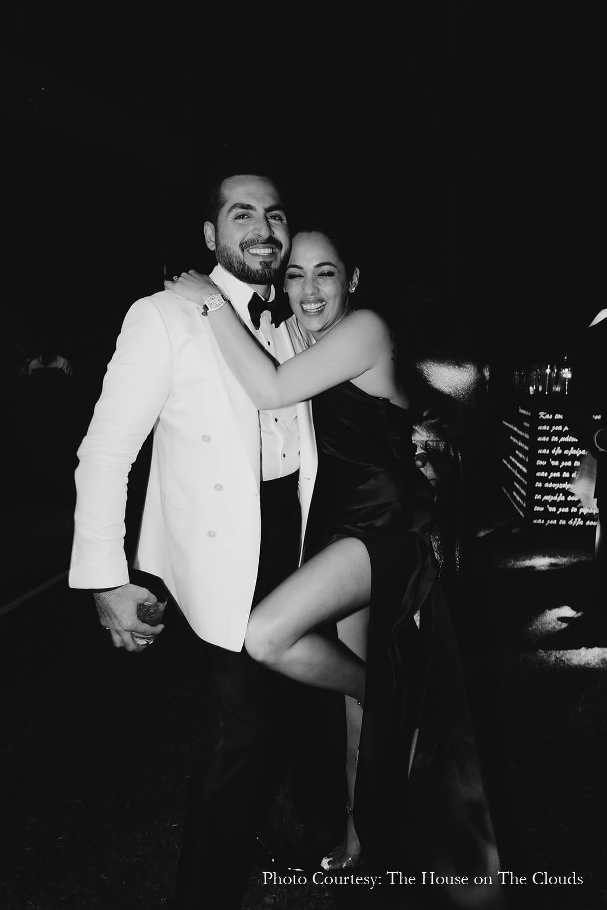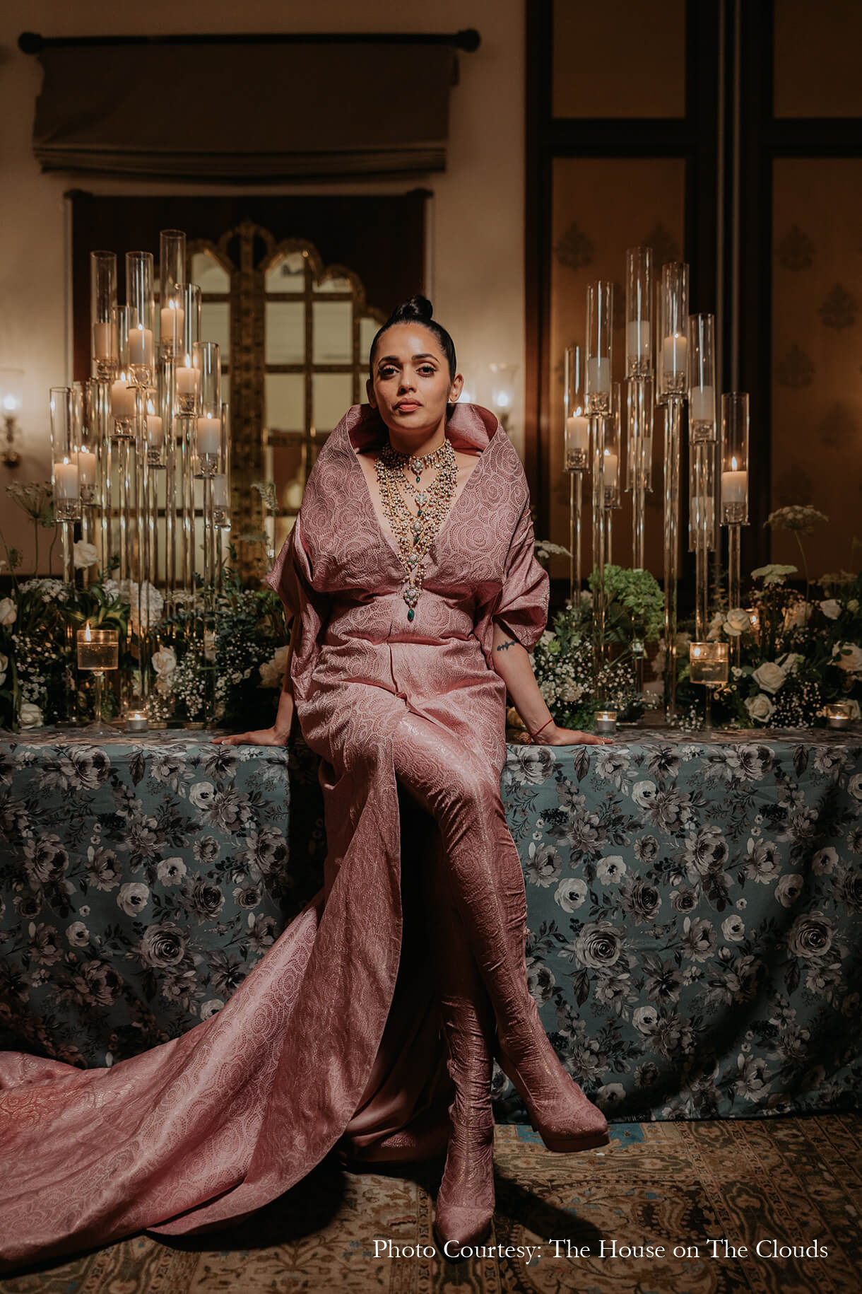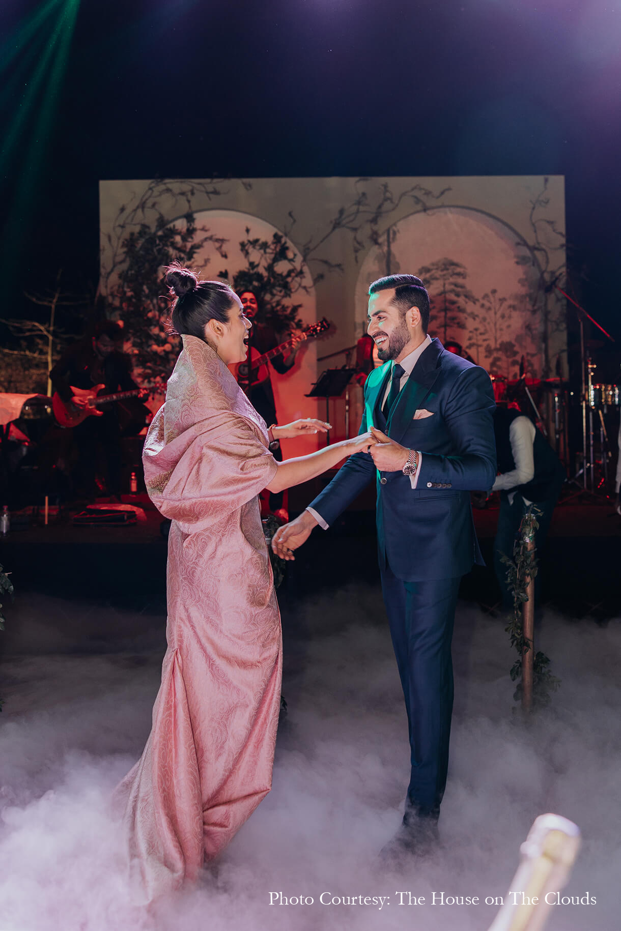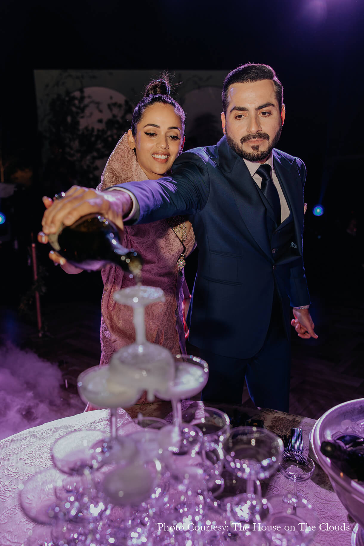 The celebrations came to a spectacular close with a reception party later that night. An extension of the wedding decor, the evening saw a lush, glasshouse lounge, candles, a champagne wall, and more, and exuded a warm, cozy vibe. The bride made a statement in a sculptural gown that she accessorized with her grandmother’s heirloom necklace, while the groom looked suave in a timeless blue suit.
