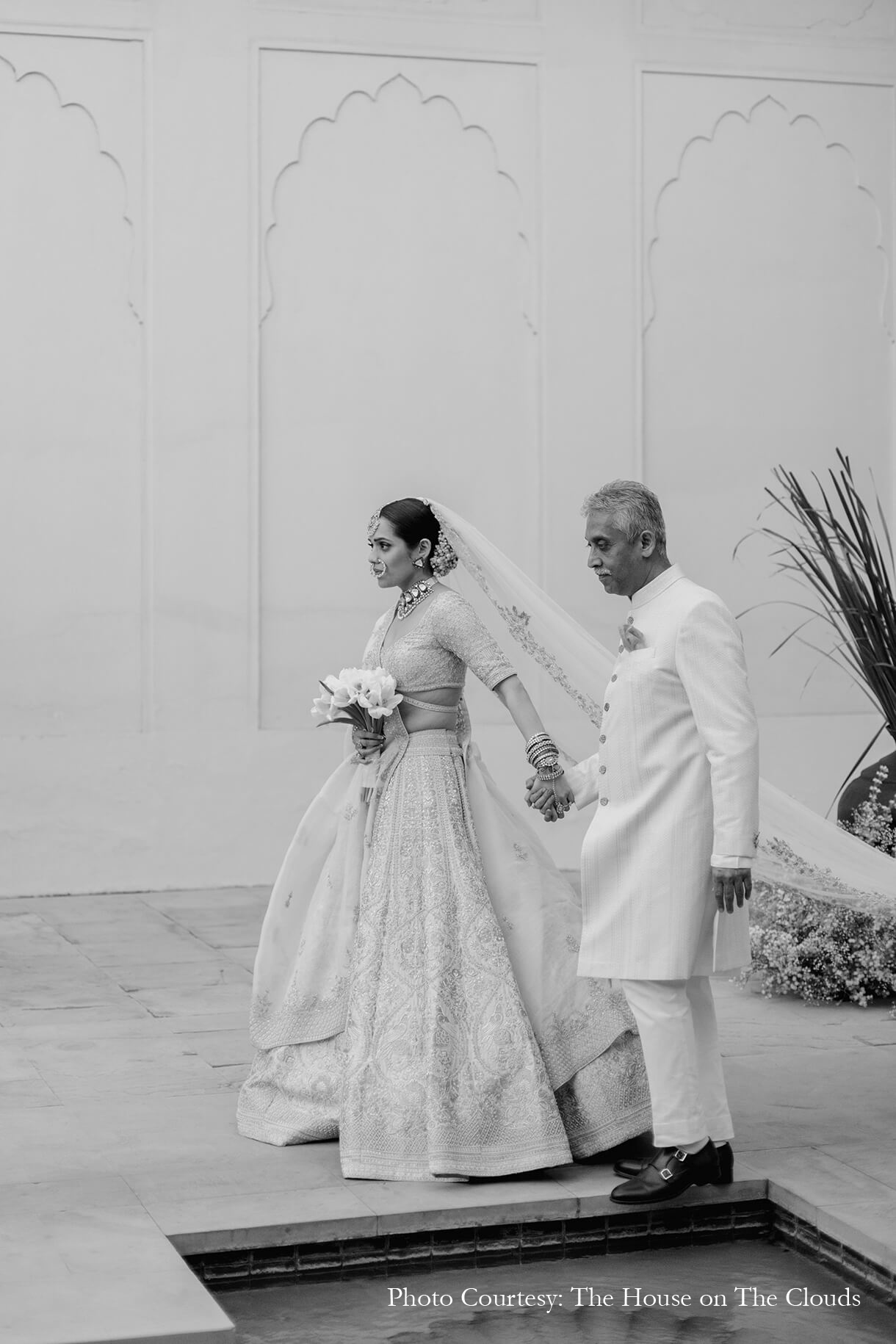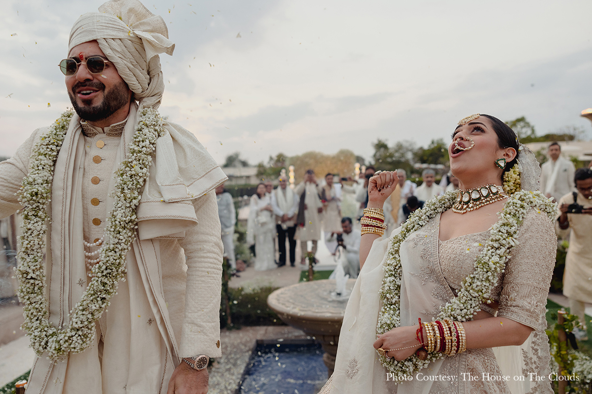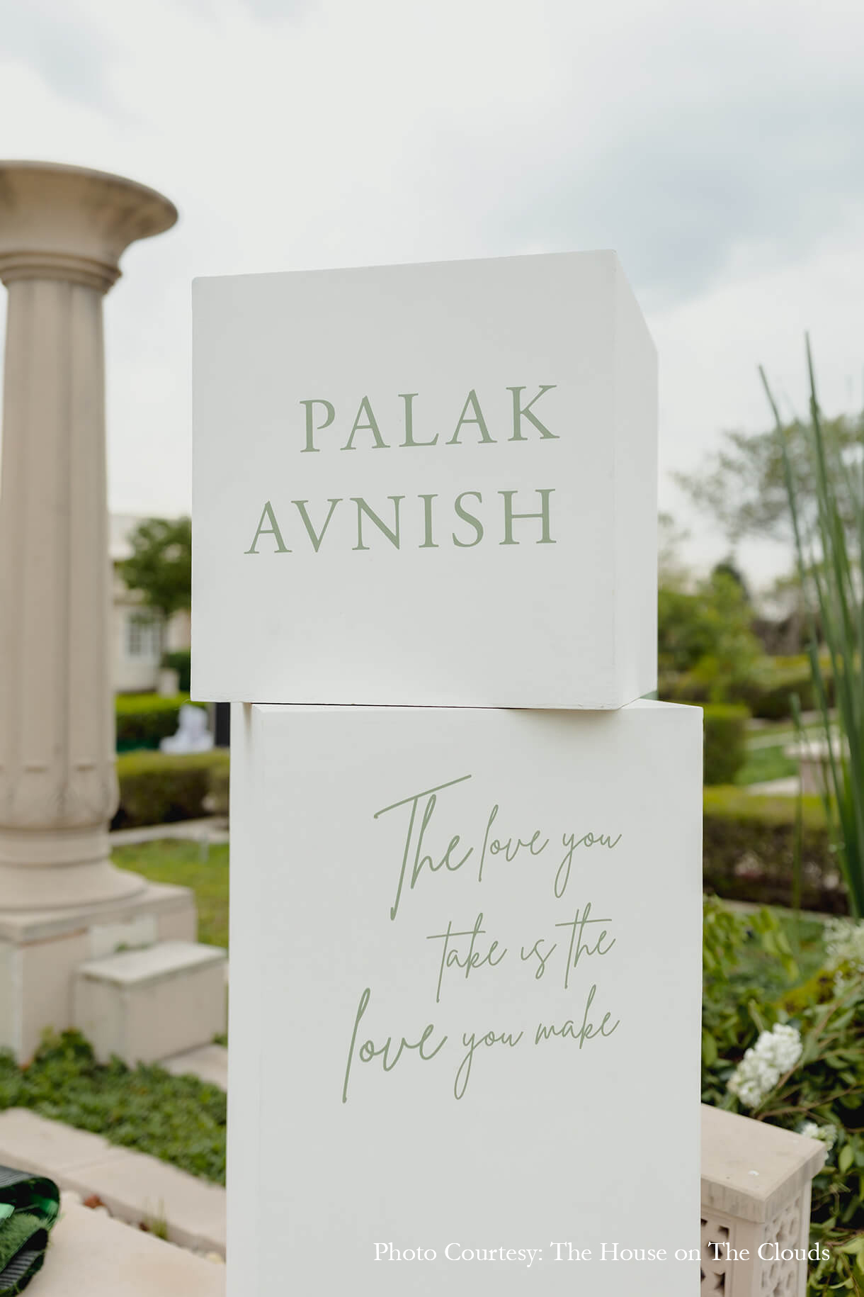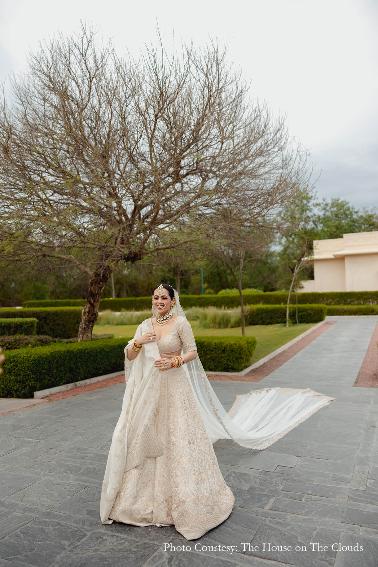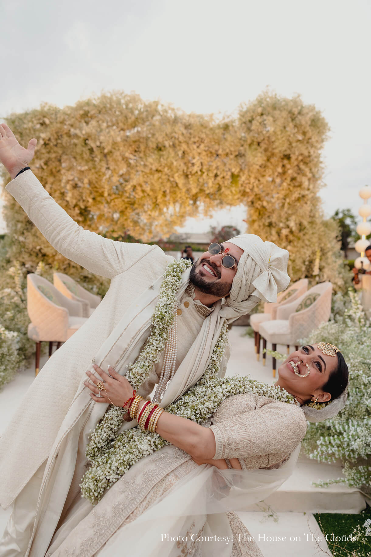 Steeped in love and thoughtfulness, the intimate garden nuptials evoked the feeling of an ethereal white wonderland with clouds of gypsophila. From cute corners of their pictures to little napkins for “happy tears” and small bells for the guests to ring after the ceremony, the function was full of charming, emotional elements. The exquisite wedding mandap of baby’s breath created an illusion that the couple was floating under the clouds as they tied the knot. Matching the color palette, the couple and their loved ones all embraced white ensembles. Staying true to her timeless and multi-layered personal style, Palak looked enchanting in an ivory bespoke lehenga that echoed her love for tradition and penchant for modernity.