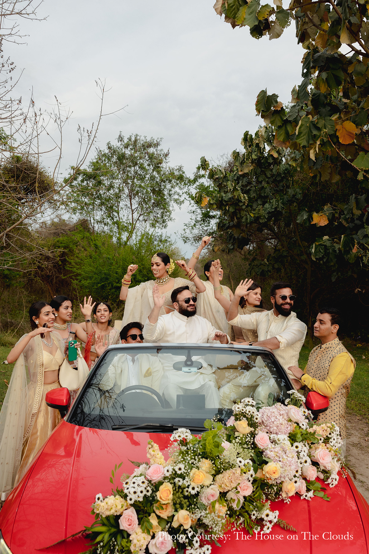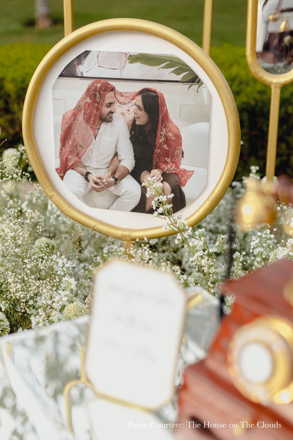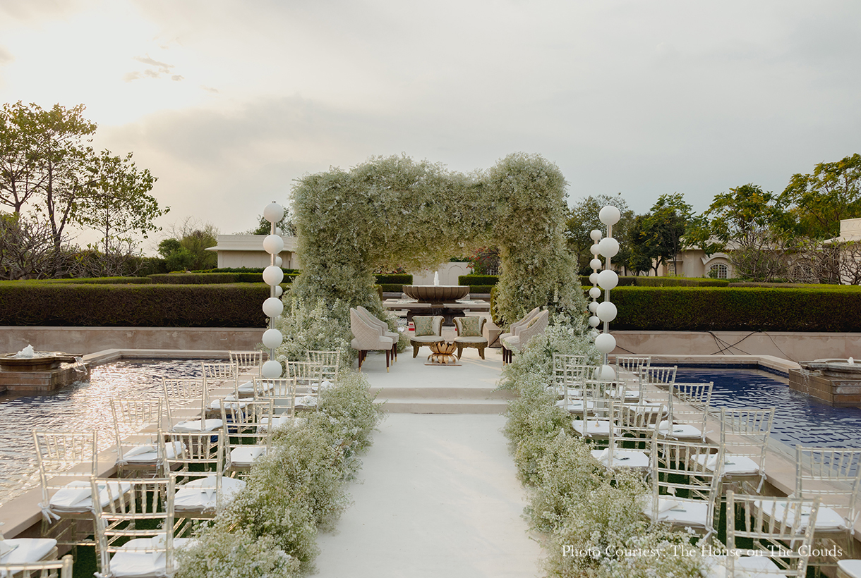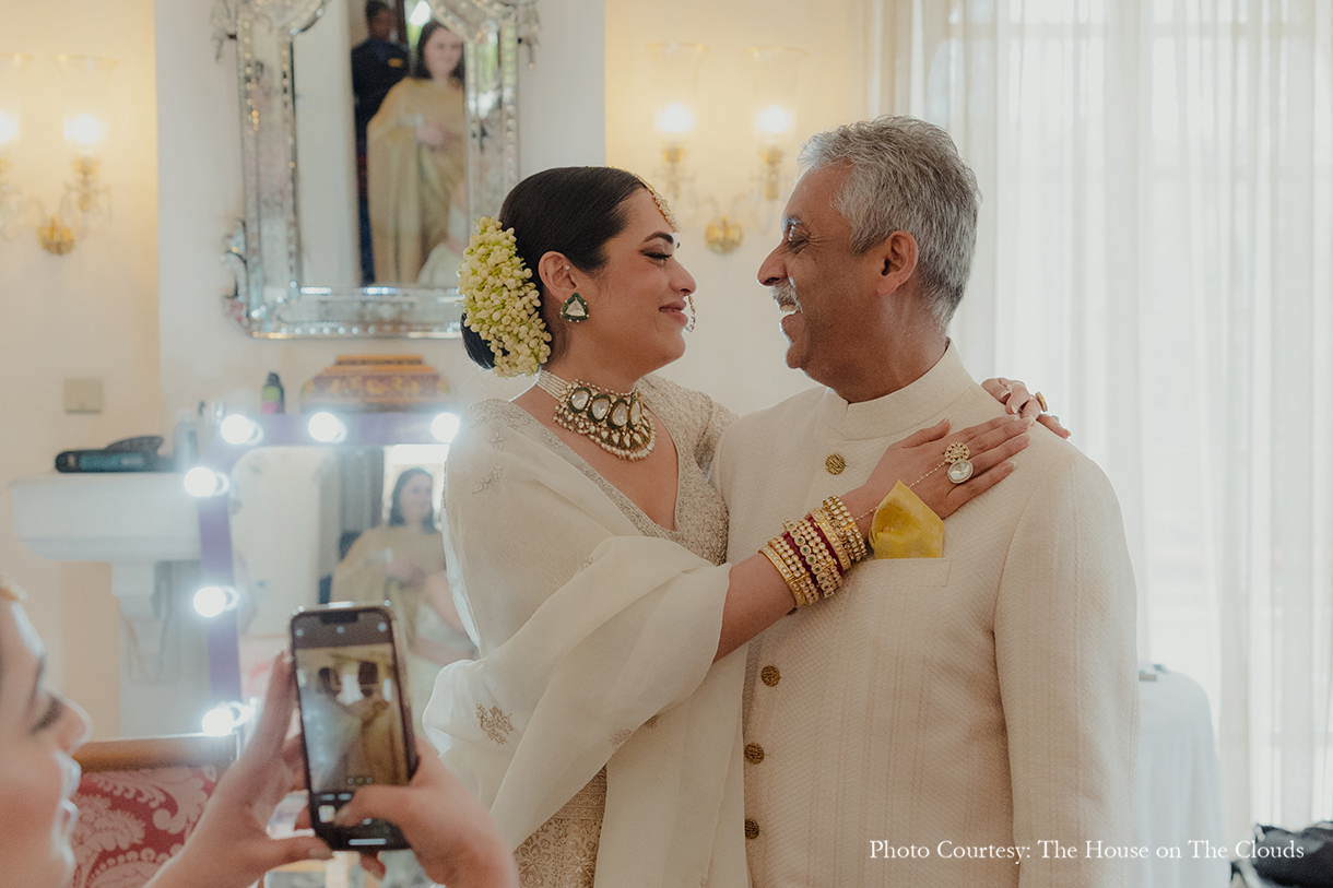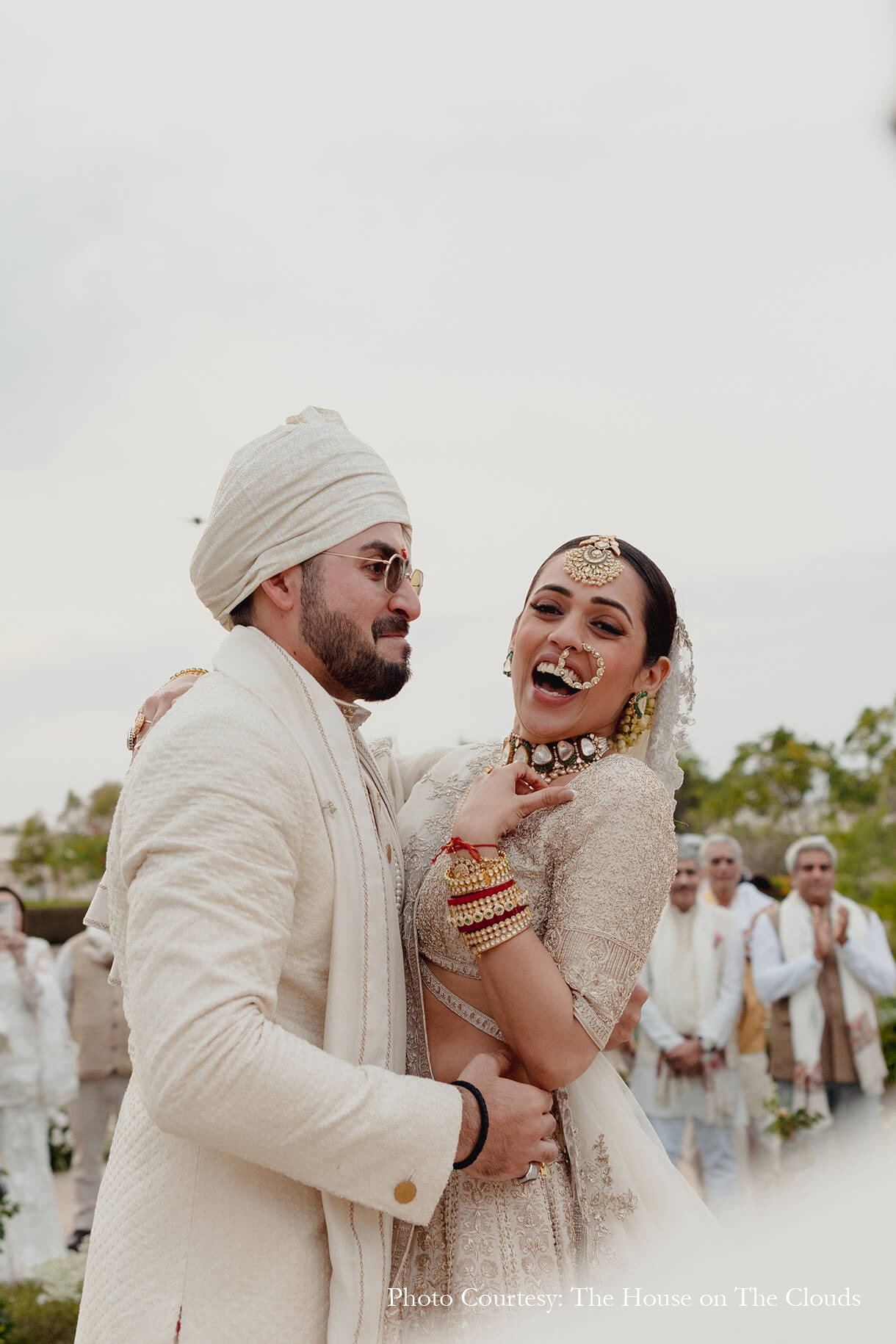 Steeped in love and thoughtfulness, the intimate garden nuptials evoked the feeling of an ethereal white wonderland with clouds of gypsophila. From cute corners of their pictures to little napkins for “happy tears” and small bells for the guests to ring after the ceremony, the function was full of charming, emotional elements. The exquisite wedding mandap of baby’s breath created an illusion that the couple was floating under the clouds as they tied the knot. Matching the color palette, the couple and their loved ones all embraced white ensembles. Staying true to her timeless and multi-layered personal style, Palak looked enchanting in an ivory bespoke lehenga that echoed her love for tradition and penchant for modernity.