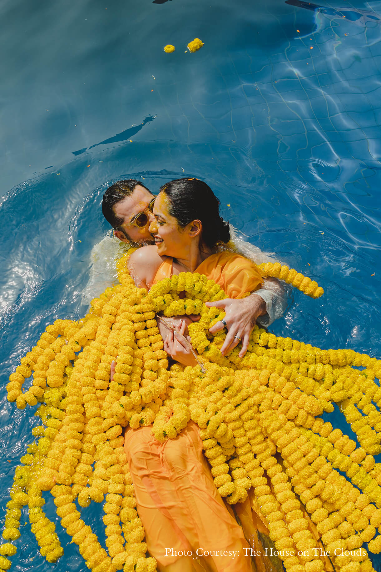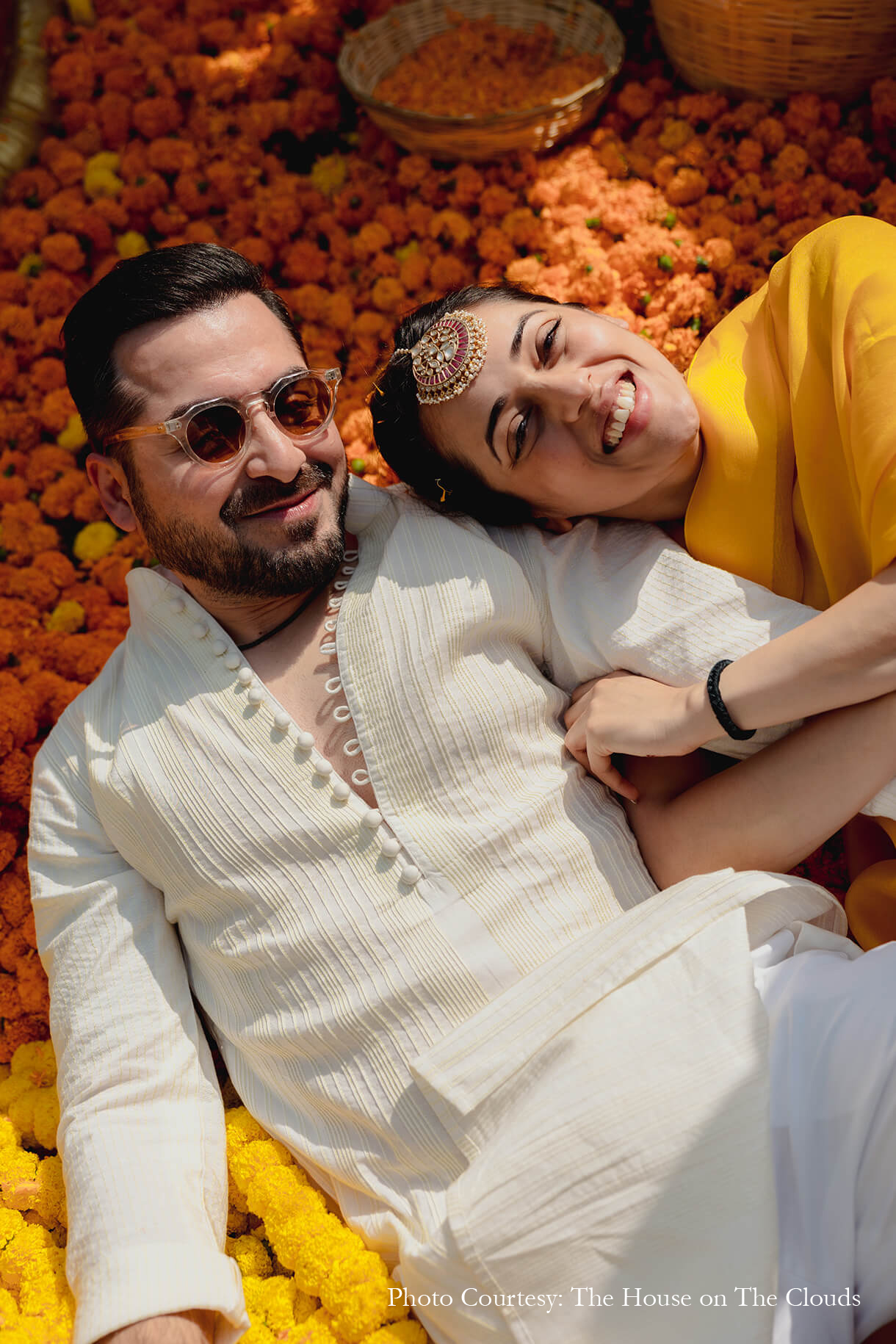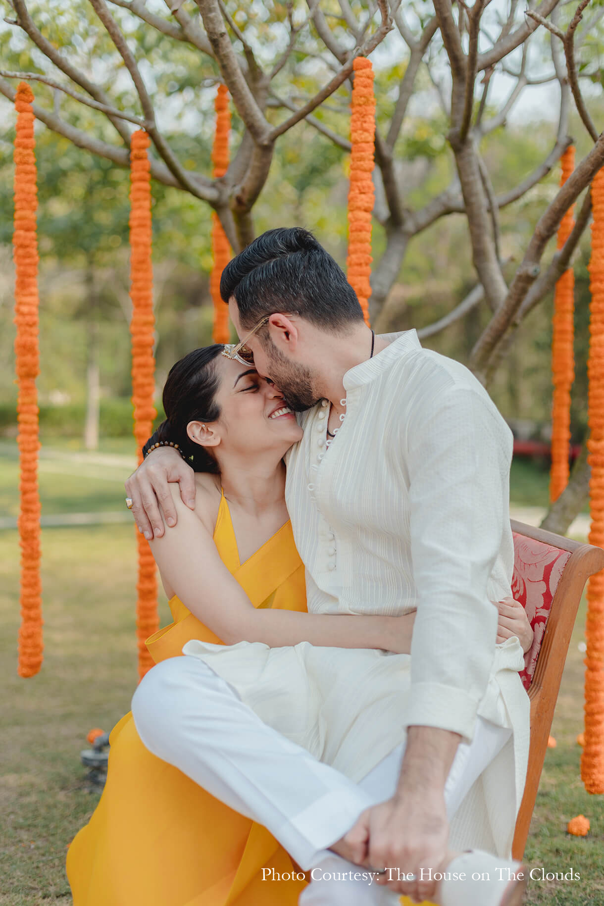 A poolside Haldi function kicked off the intimate, 2-day affair. Drenched in marigolds, the sunkissed soiree lit up the lush lawns with a burst of color, as the bride and groom were doused in haldi, love, and blessings. The bride paired her simple yellow saree with a statement maang tikka while the groom wore a textured ivory kurta set.