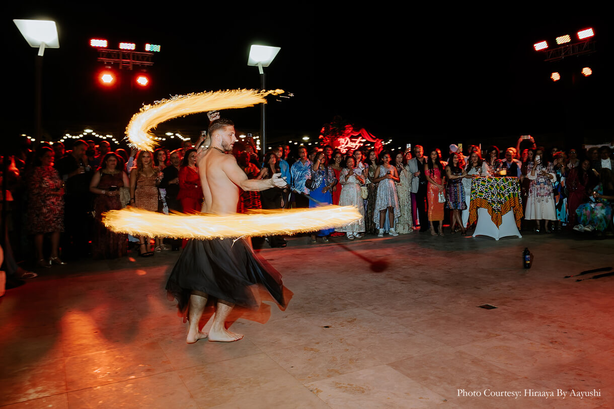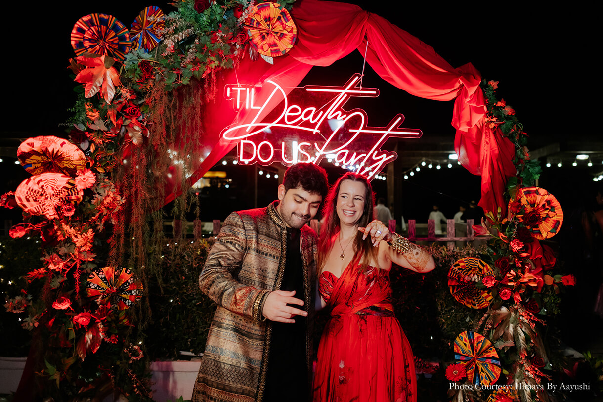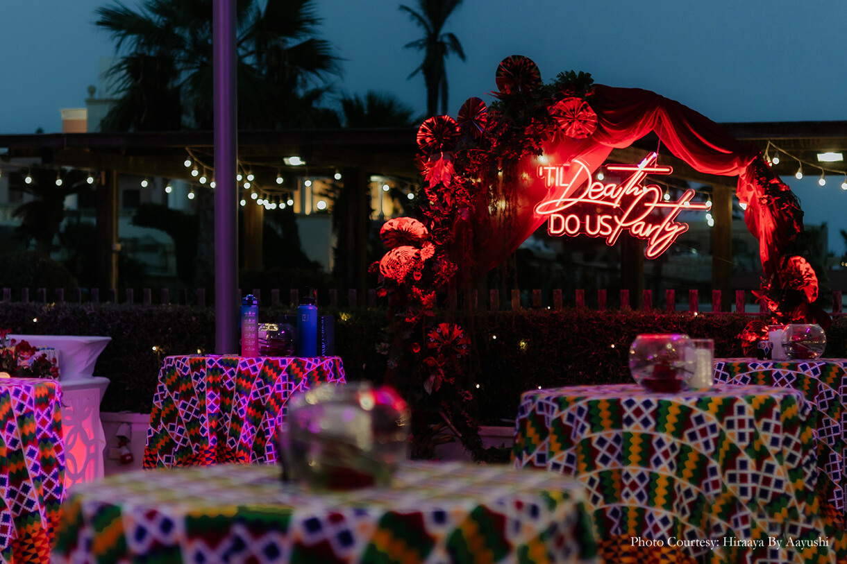 Rishabh shares, “This was the first function with everyone. It was Ghanaian-themed decor to represent our ties to Ghana. There were some amazing fire shows and dancers as entertainment. It was an outdoor restaurant located at the hotel named Palio’s Trattoria.” Rhea goes on to add, “The occasion was adorned with woody tones, red wildflowers, greens, and amber mood lighting. And the night came alive with some extremely engaging entertainment.”