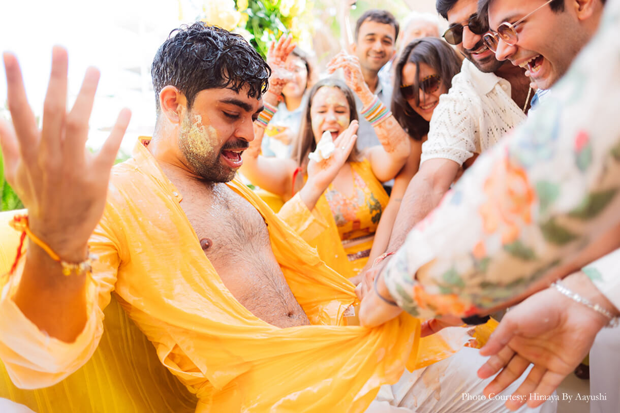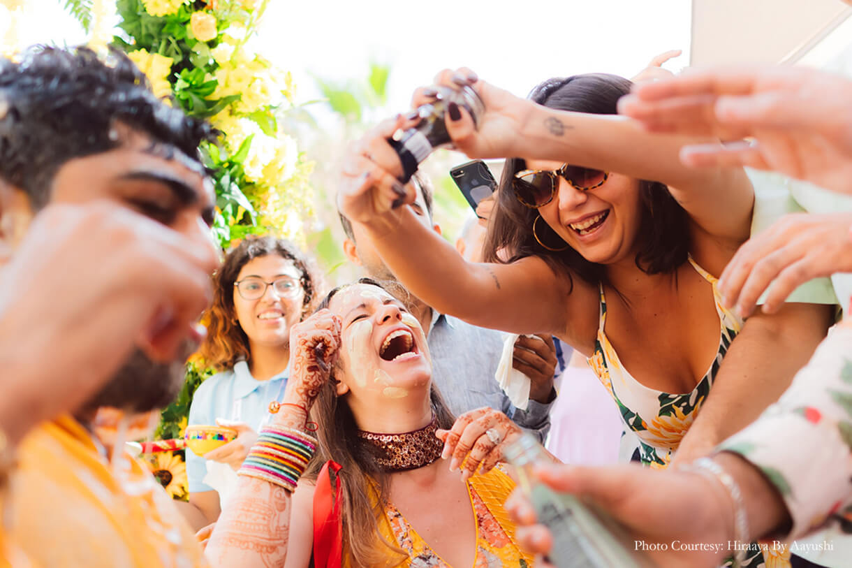 The couple shares, “The Haldi was meant to be relatively casual but it turned out to be quite the party. While many people preferred to sleep in and rest for the later part of the day, those who were there made sure to come with all their energy. Instead of coffee, there was beer. Instead of light music, it was a party all over again. Some continued from the previous night into this event!”
