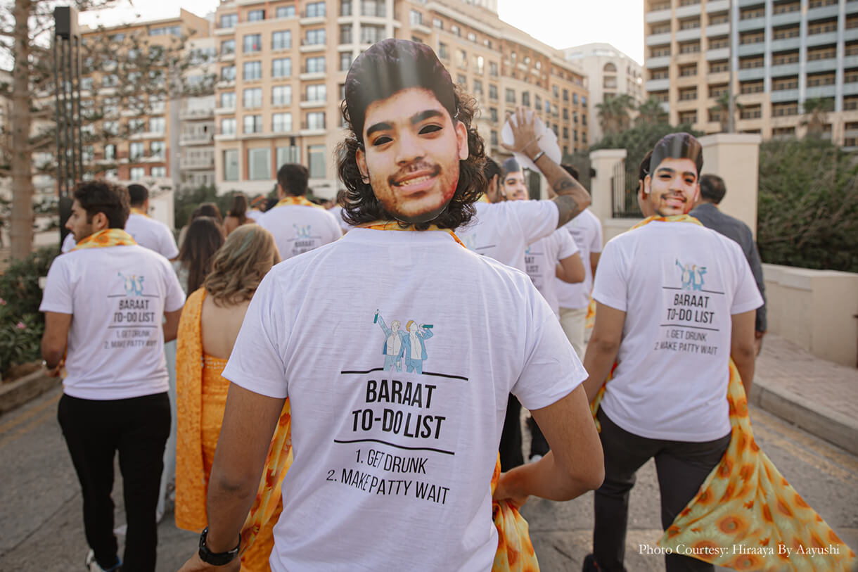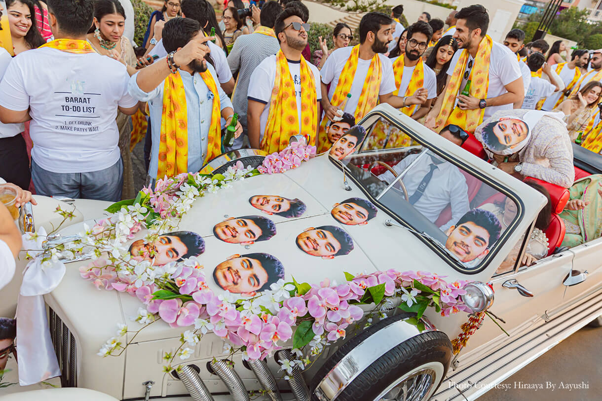 Rishabh shares, “We had organized Baraat t-shirts for all the guests to wear. We had a few snacks, and some drinks, took some nice picturesque photos and then made our way towards the vintage car, moving bar, and moving sound truck with DJ Maddy playing some tunes. The original aim was to reach the Jai Mala stage by 5:30 pm but we ended up getting there at 8:30 pm. It was impossible to get the car moving so much that our Maltese driver left and went for a walk! A very close friend had surprised us all by bringing masks of my face for everyone to wear. It was an absolutely strange and funny moment to see everyone wearing masks of me. I had no idea who I was looking at and who I was dancing with!