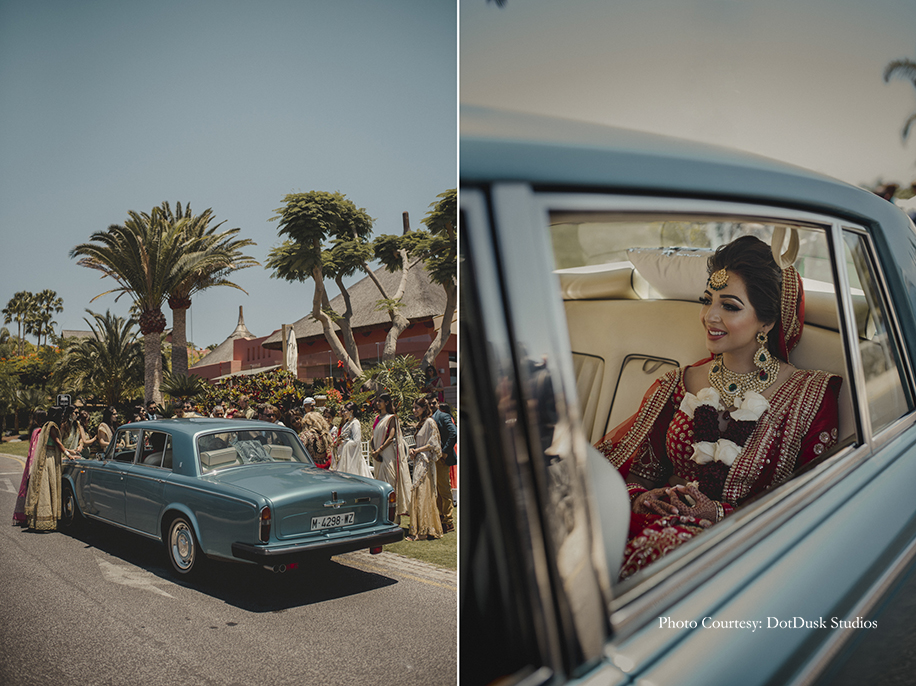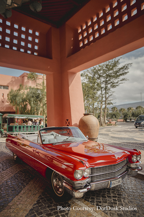 The final day of the festivities began with a haldi ceremony, which was followed by the wedding. Shohil arrived in style, cruising through the hotel grounds in a red convertible. The bride made her entrance in a more traditional way, with her brothers escorting her to the mandap under a phoolon ki chadar. Created with over a thousand roses, the gorgeous mandap overlooked the vast Atlantic ocean. The couple both wore outfits by Sabyasachi Mukherjee. The wedding ceremony was conducted by priest Hemang Bhatt from London. Following the ceremony, the newlyweds left in a vintage Rolls Royce.
