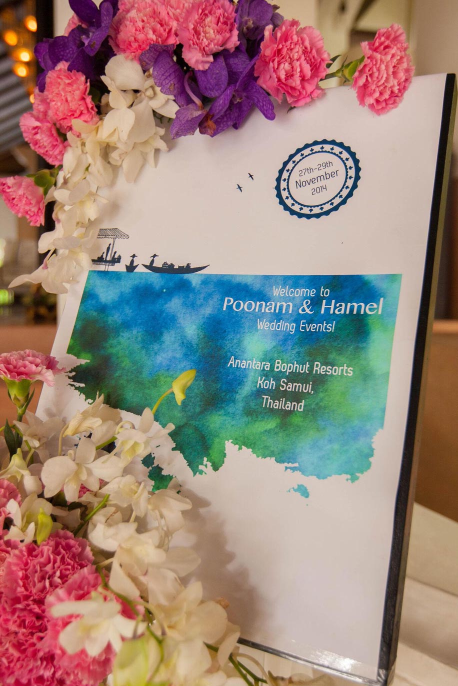 Accompanied by Neha from Foreign Wedding Planners, the couple visited several resorts around Thailand until they got to Anantara Resort, Bophut in Koh Samui. “It was love at first sight for us!” Poonam explains, “It was intimate with incredibly lush landscaping.” And the couple went bananas for the resort mascot featuring coconuts and monkeys. “They used this everywhere from the driveways to the lobbies, from candle stands to table centerpieces, even the pool had statues of monkeys with coconuts!”