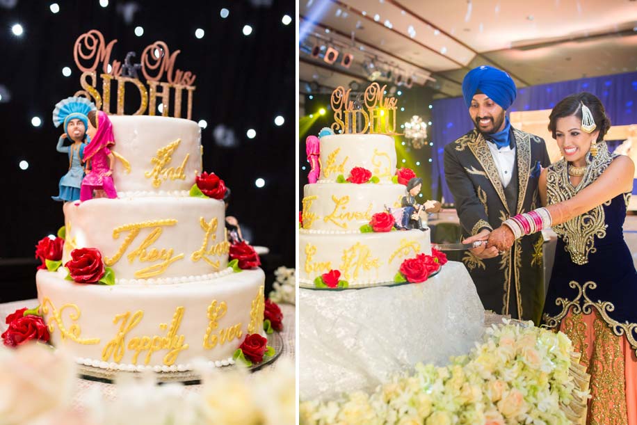 The wedding cake, topped with miniature dolls dressed as Poonam and KJ at their first bhangra performance together and in their reception attire, featured a palette of flavours – tahitian vanilla, passion fruit and devil’s food chocolate.