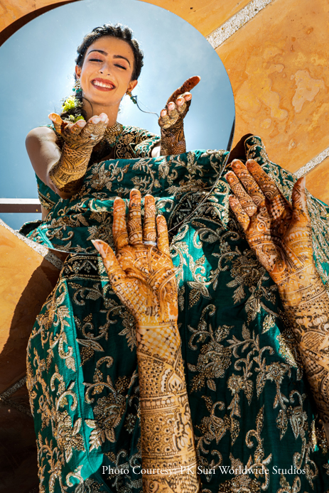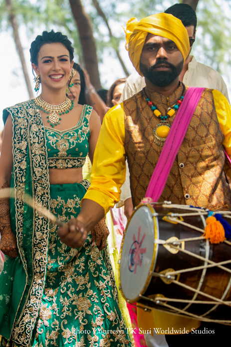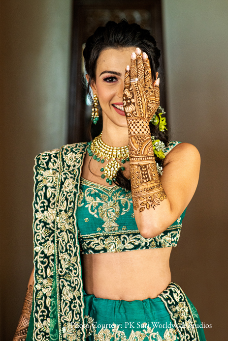 “The next morning we hosted the mehndi ceremony, which came alive with all the cheery colors common at Indian weddings. We used a combination of yellow and soft pink drapes and flowers to deck up the space. The divans, as well as the dancefloor, carried Indian patterns in bright hues which added to the liveliness of the function. I arrived at the event accompanied by dhol walas, wearing a green lehenga. Nicolas sported an Indian attire – a kurta along with a floral bandi for himself.”