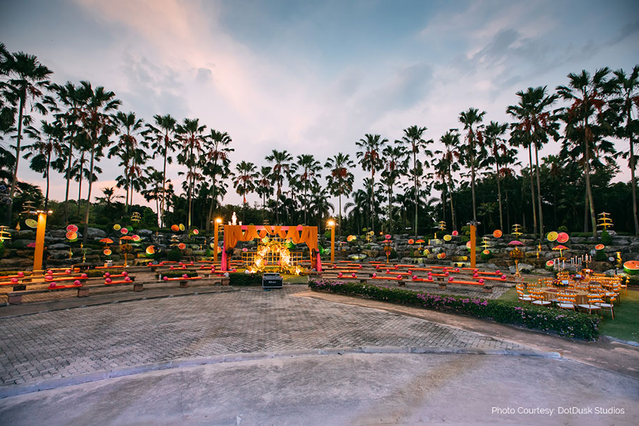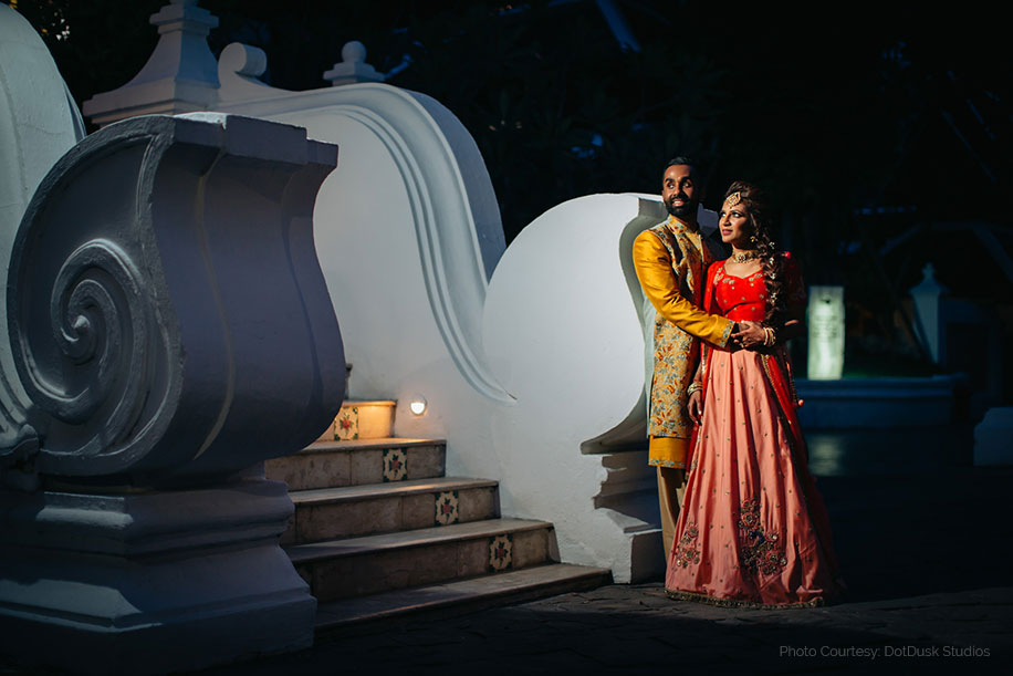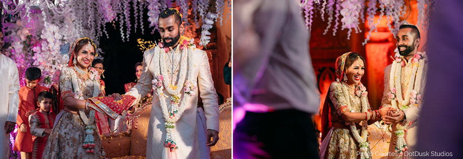 “Our wedding ceremony was a long one as it included a combination of Gujarati and South Indian rituals. Our mandap and the aisle leading to it was beautifully decorated with fresh flowers. A temple behind our mandap made for a picturesque backdrop as it was part of the resort itself.”