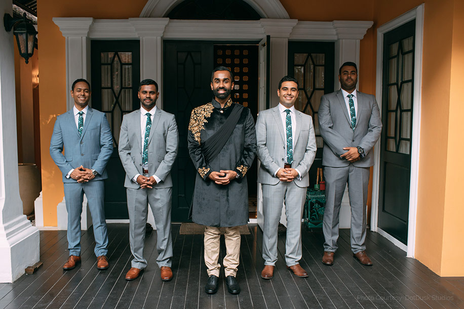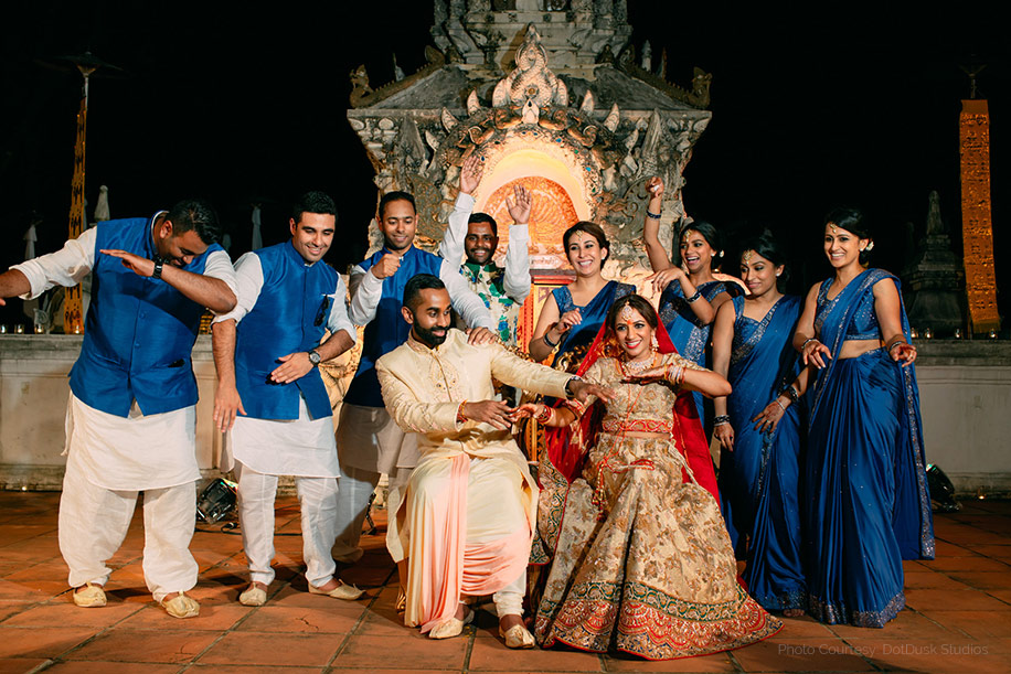 Priya wore a beautiful beige and red lehenga with stunning embellishments and motifs with a hint of green. She paired this with a gold and pearls ‘maang tikka’ (forehead ornament), and elegant necklaces. Her bridesmaids all wore matching blue sarees with glittery silver borders. Puneet wore a classy off-white sherwani-dhoti ensemble that had peach and pink accents. He paired this with ornate ‘mojris’ (ethnic Indian shoes). His groomsmen wore blue Nehru jackets over white kurta-pajamas to match the bridesmaids.