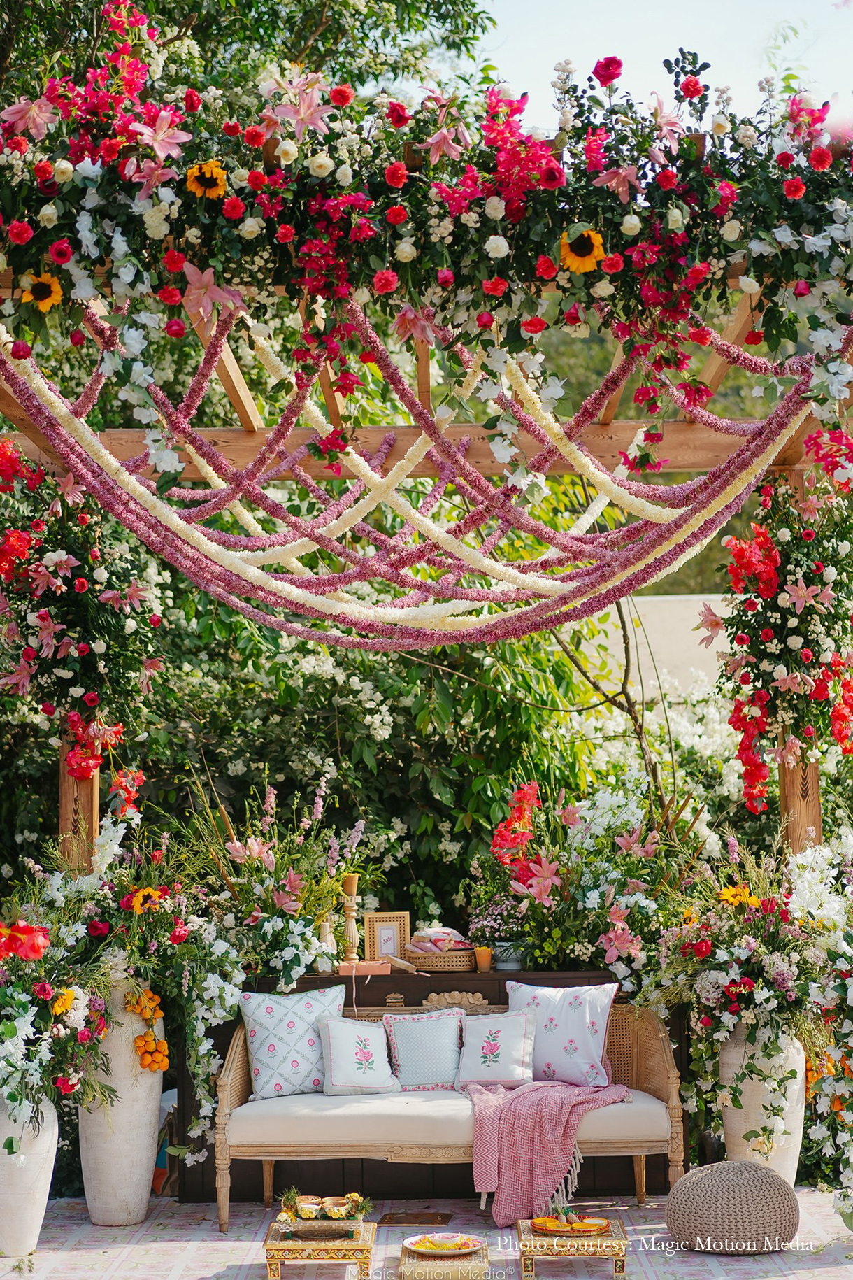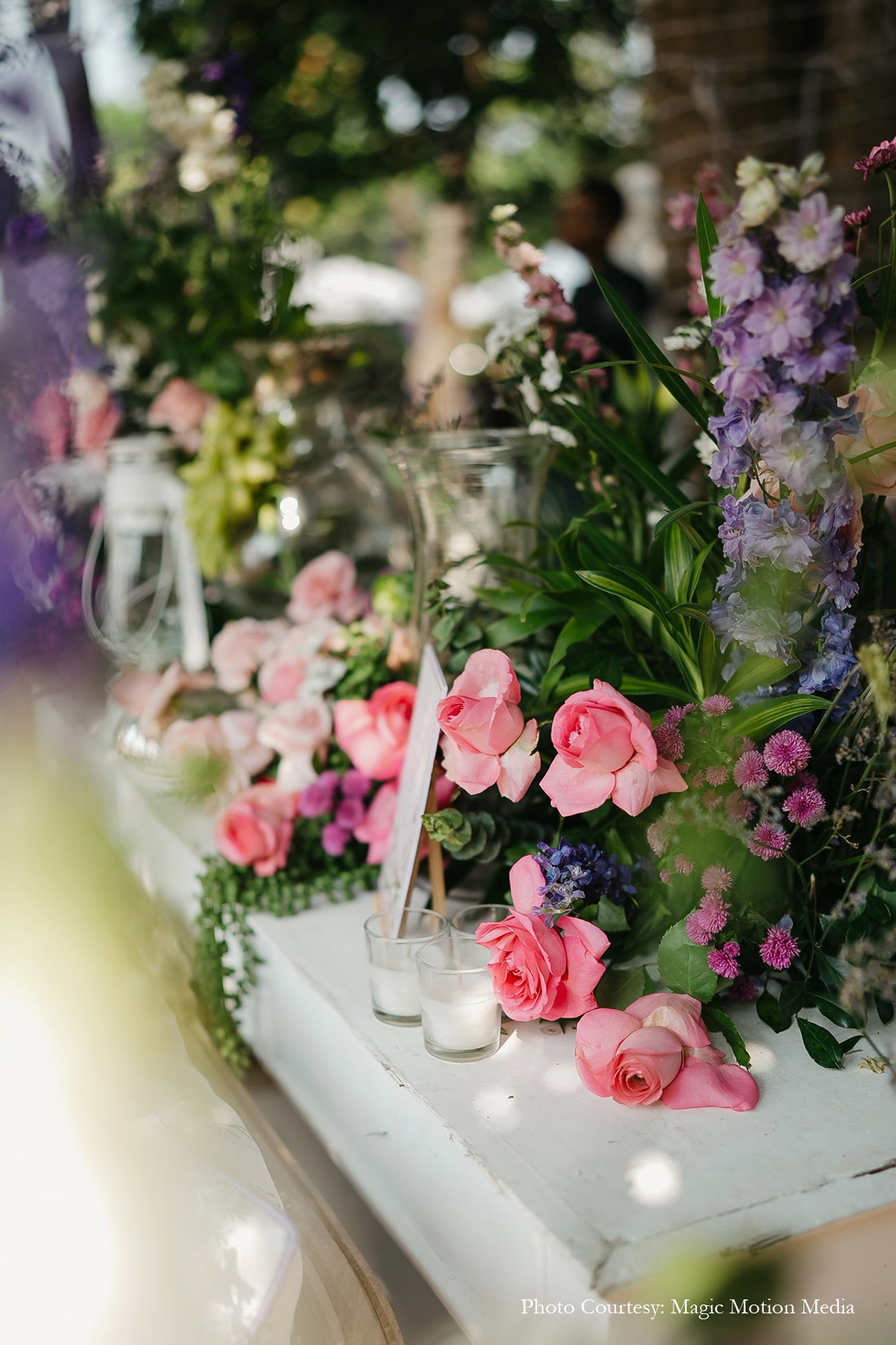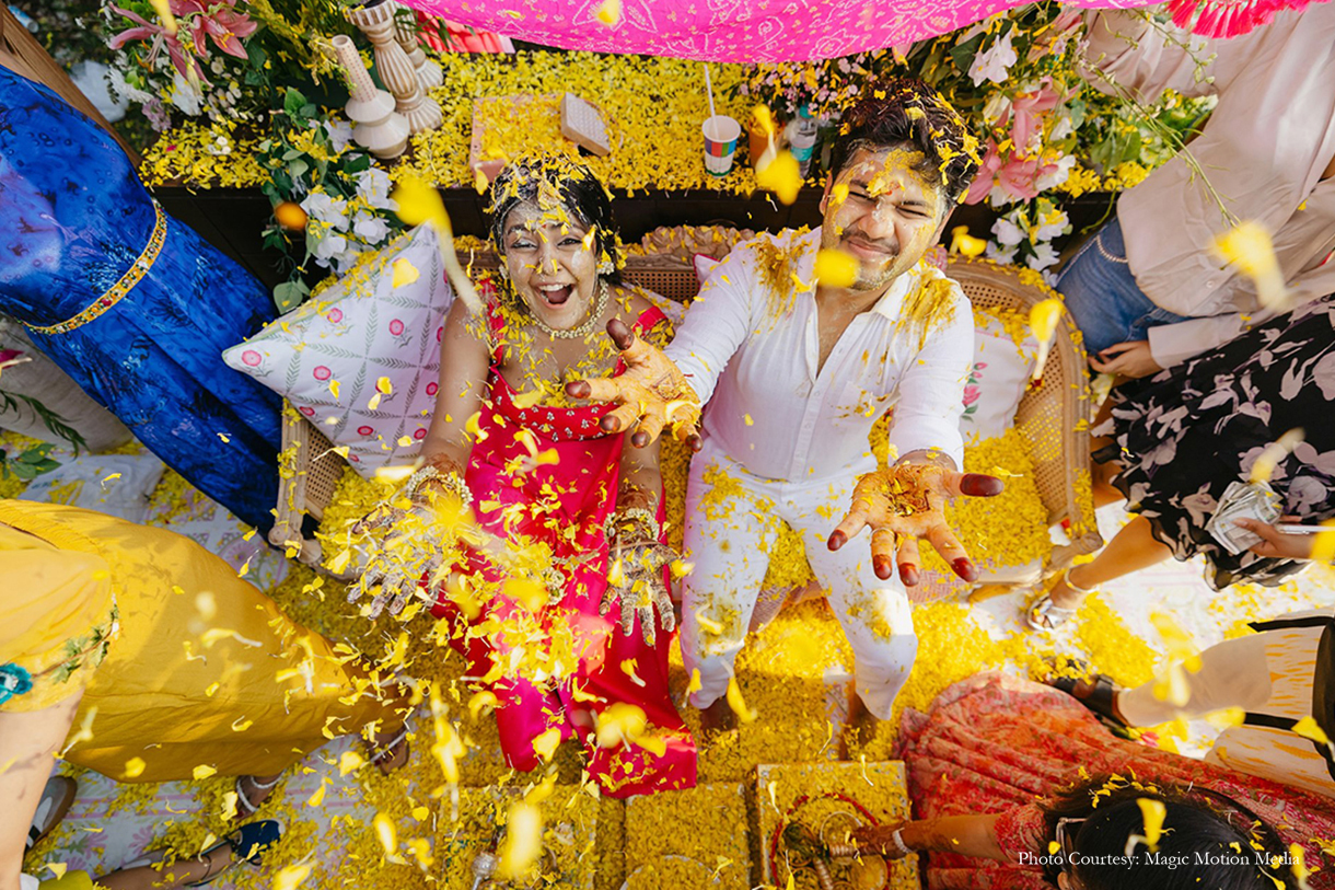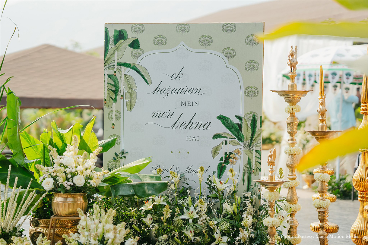 The Bhaat ceremony transitioned into a lively Haldi celebration, where the decor burst forth with flowers in every hue, creating a whimsical atmosphere against the lush greenery. Stepping away from traditional yellows, the couple donned shades of pink that harmonized beautifully with the summery floral theme. The event radiated love, laughter, and joy, filled with music, dance, and showers of confetti. The rituals were enriched with heartfelt family moments, making the day truly memorable.