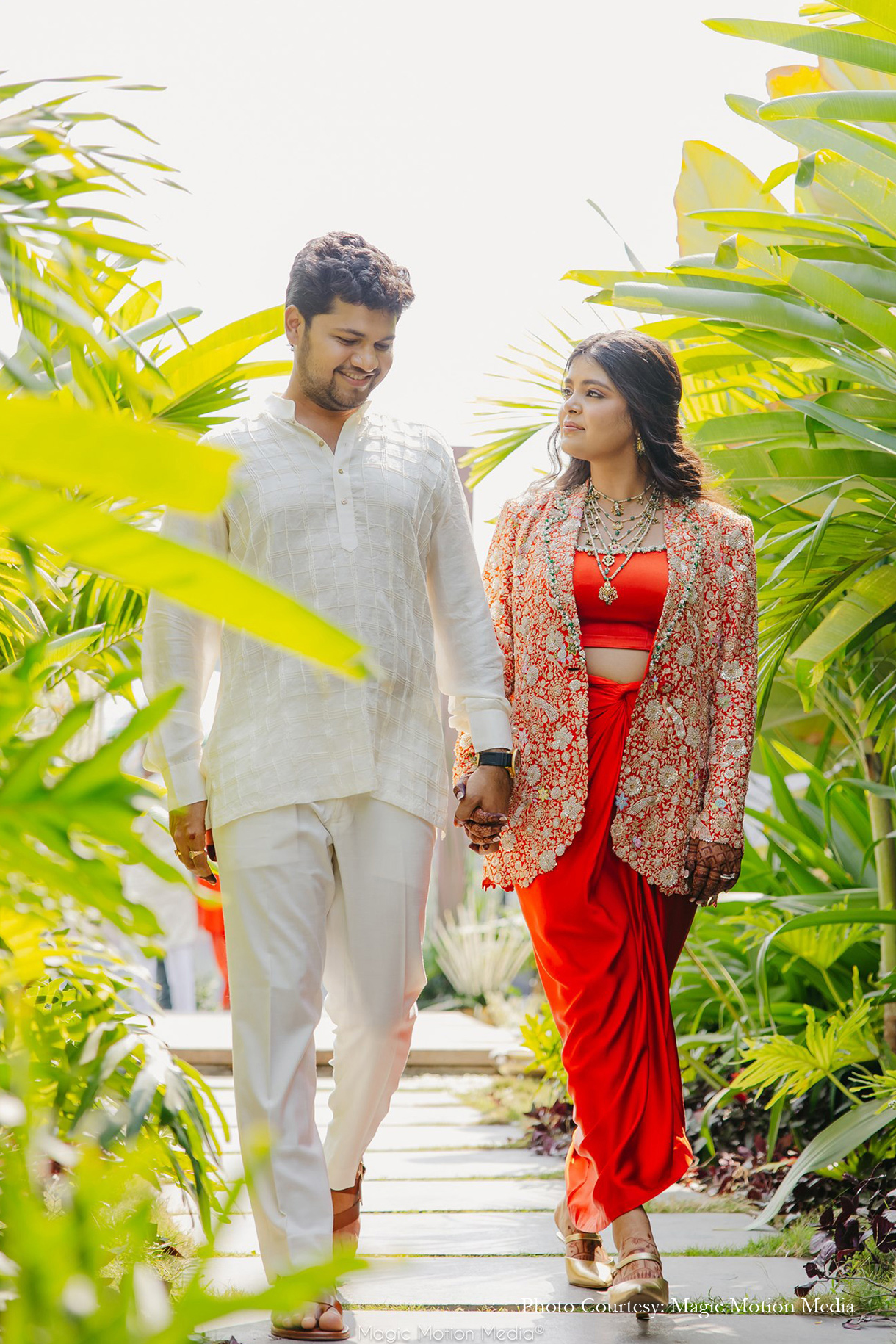 The following day commenced with the Bhaat ceremony, set against the tranquil backdrop of the pool. The ambiance was adorned in a serene palette of white and gold, with umbrellas embellished with Indian motifs, vibrant flowers, and flowing drapes that gave a modern flair to the traditional aesthetic of the decor. The groom looked relaxed in an all-white ensemble, while the bride stood out in a striking indo-western outfit in vivid orange, complete with a bold blazer that perfectly channeled the decor’s essence of fusion.