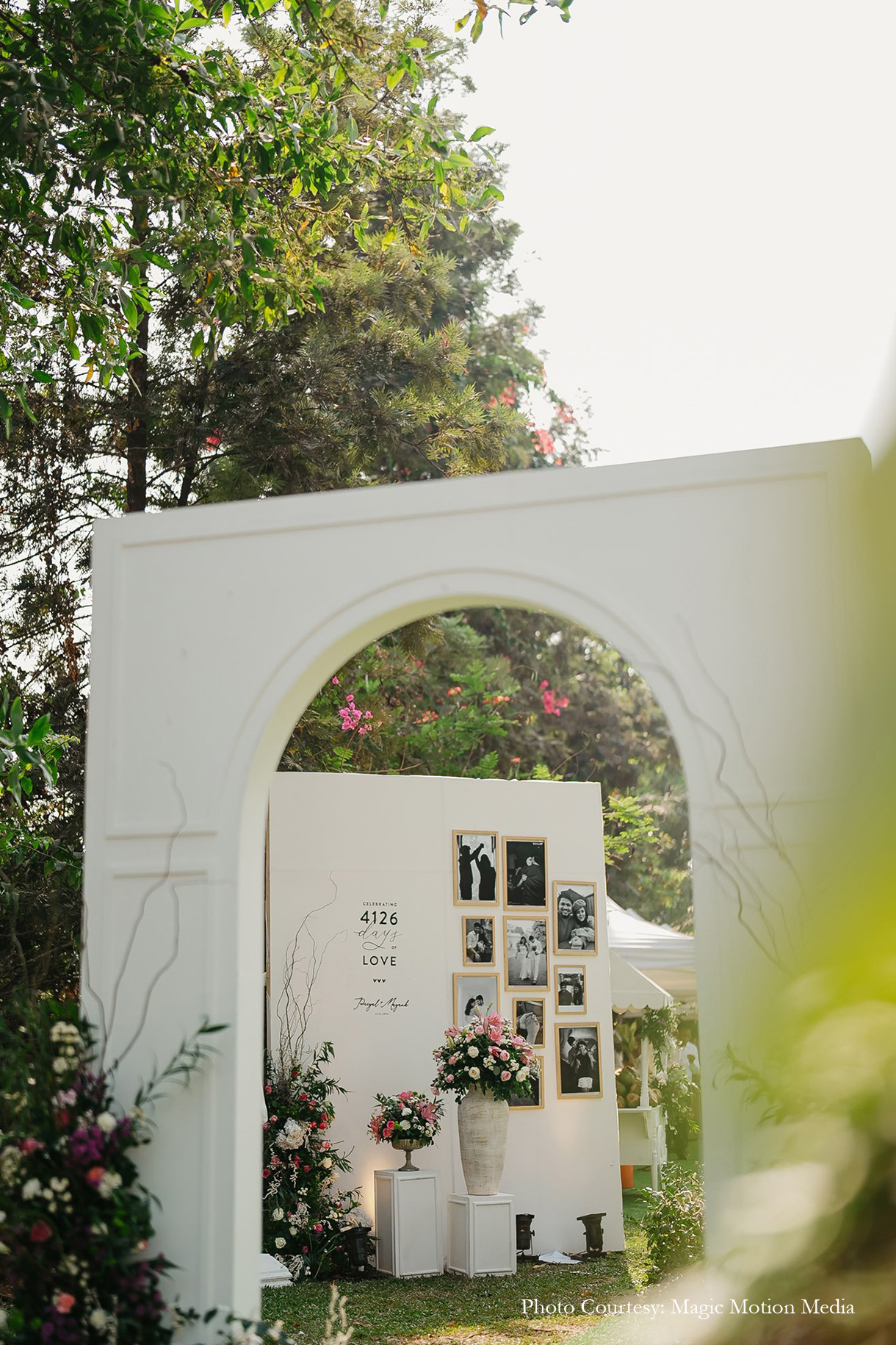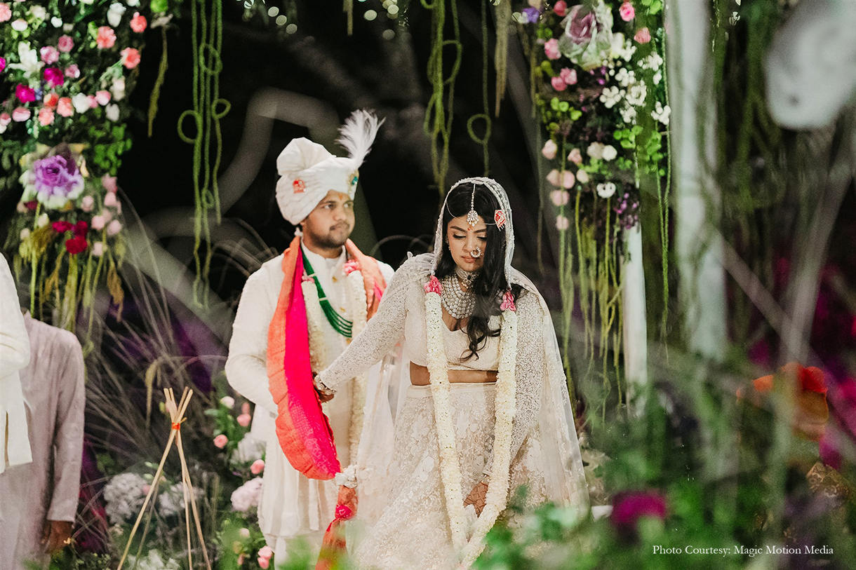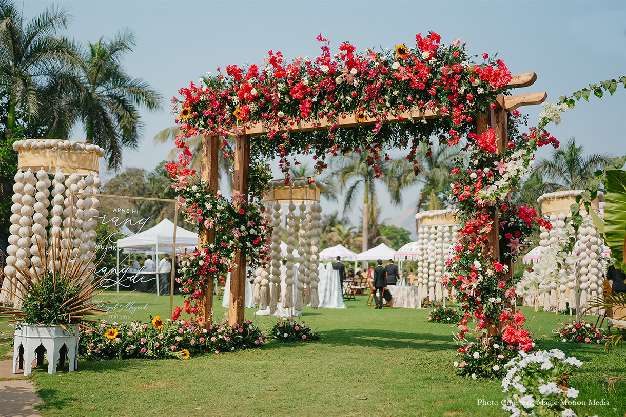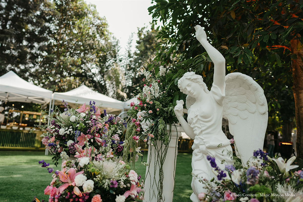 The wedding unfolded like a Tuscan fairytale amidst the expanse of lush green lawns, vibrant bursts of flowers, and elegant marble statues that captivated the senses. A grand welcome board at the entrance showcased the couple’s journey since 2012, inviting guests into their story. Dressed in white, both the bride and groom exuded an ethereal charm. The breathtaking floral mandap and aisle embraced a wild, untamed beauty, eschewing perfection for a more natural allure. Surrounded by applause, the couple exchanged garlands and sealed their vows, marking the beginning of their new chapter together.