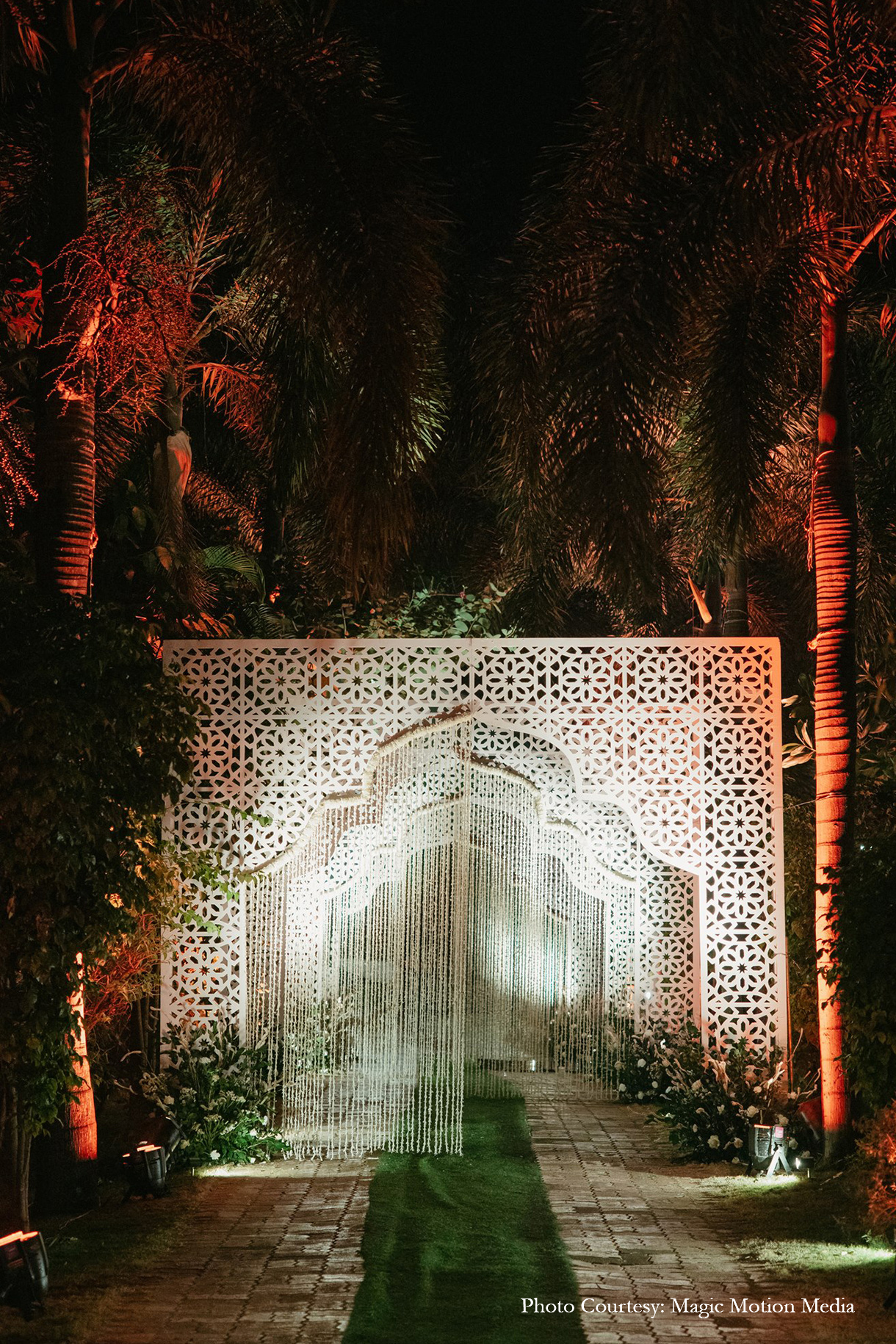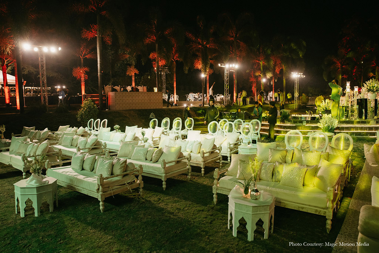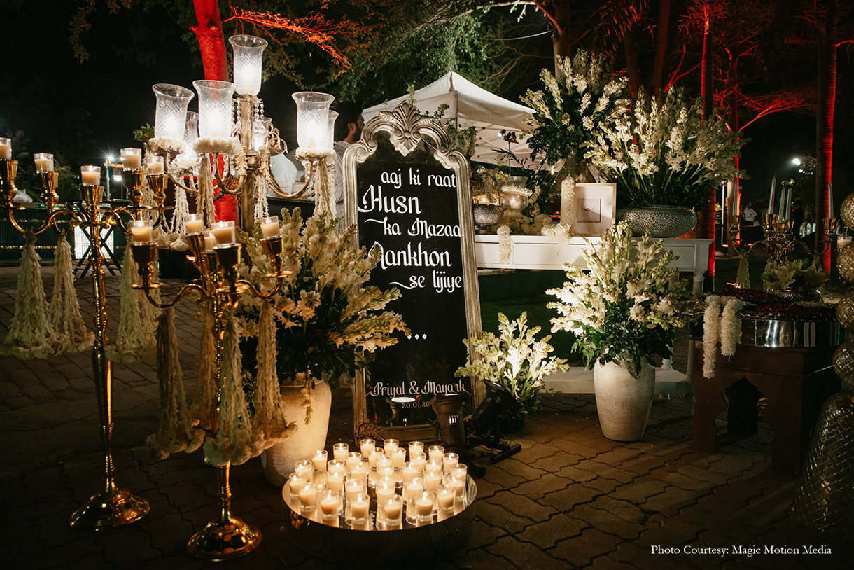 The celebrations kicked off with a Sufi night, where the ambiance beautifully fused elegance with a touch of royal opulence. Mughal architectural elements, such as intricate jaali work and graceful arches, adorned the venue, complemented by ornate candle stands and the enchanting aroma of Rajnigandha flowers. The air was filled with the musical stylings of a Sufi band, inviting everyone to dance and revel in the moment. The bride, draped in a pearl-detailed white saree, and the groom, clad in a classic black achkan, created a perfect visual contrast that added to the evening’s charm.