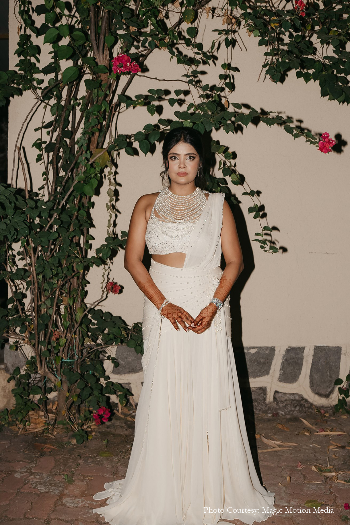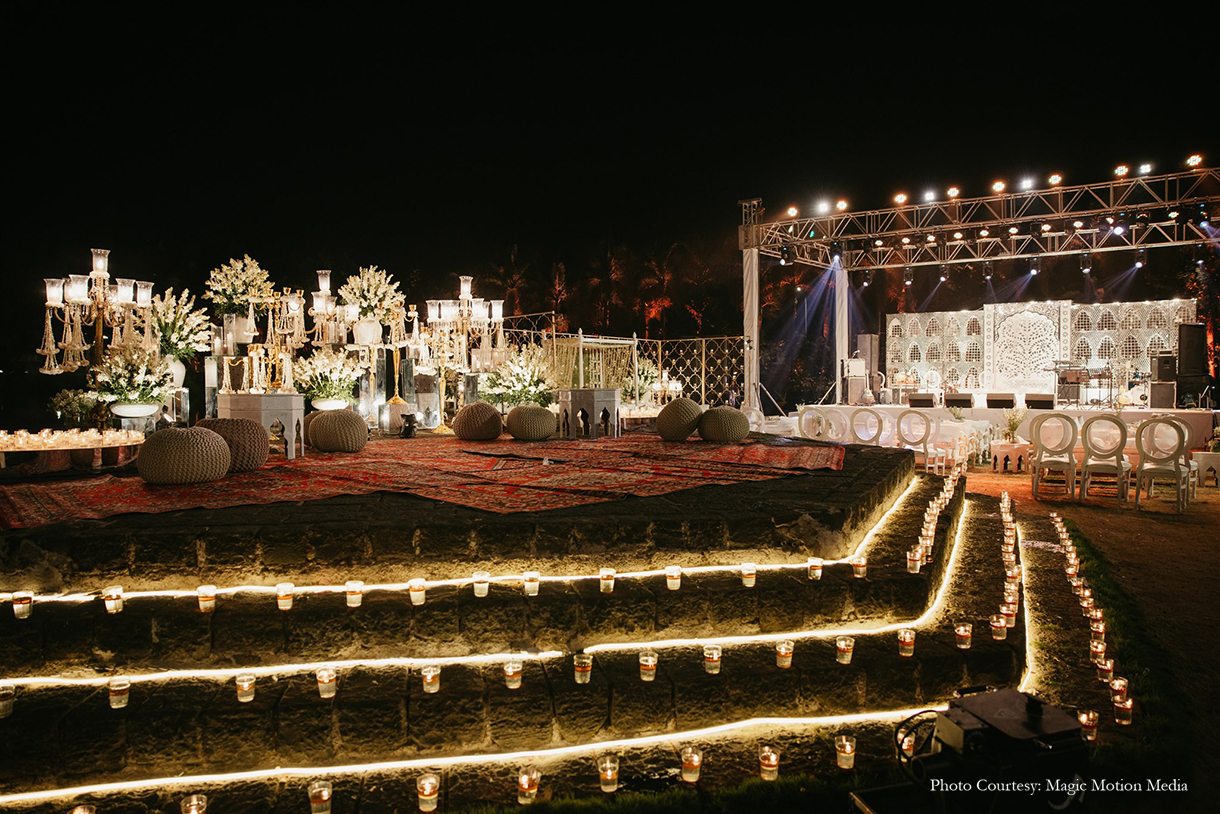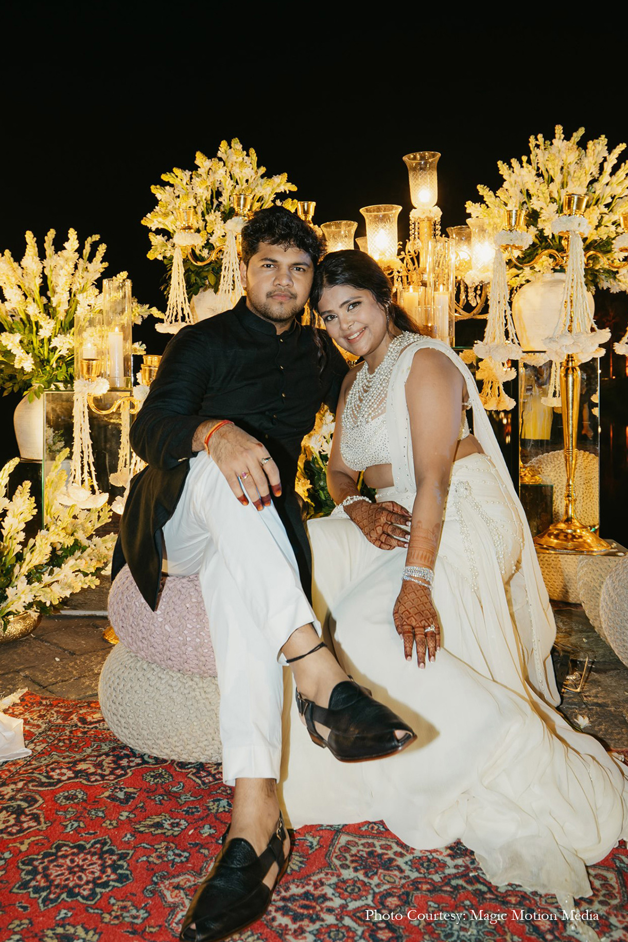 The celebrations kicked off with a Sufi night, where the ambiance beautifully fused elegance with a touch of royal opulence. Mughal architectural elements, such as intricate jaali work and graceful arches, adorned the venue, complemented by ornate candle stands and the enchanting aroma of Rajnigandha flowers. The air was filled with the musical stylings of a Sufi band, inviting everyone to dance and revel in the moment. The bride, draped in a pearl-detailed white saree, and the groom, clad in a classic black achkan, created a perfect visual contrast that added to the evening’s charm.