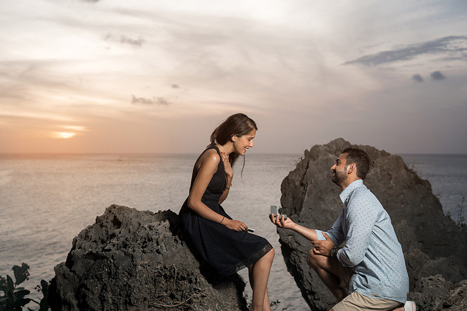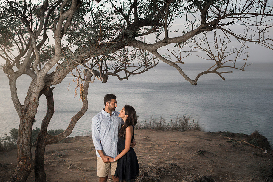 “We were in Bali for our friend’s wedding, and after all the functions got over, Deepesh insisted we go for an early supper at sunset. He also mentioned there’ll be a photographer as a part of the dinner package for the evening since he was designing a photobook and wanted to capture all our special moments from the trip. I knew he was a hopeless romantic at heart and was capable of pulling off something grand even for a date, so I didn’t suspect the idea proposed by him. As we approached the stunning cliff-top overlooking the ocean, our drivers (official photographers) insisted we get our pictures clicked with the beautiful sunset as the backdrop. After clicking a few photos, Deepesh pulled out a little book from his bag and began reading it. The book had heartfelt notes written against all our pictures. It wasn’t until the last page of the book that I heard Deepesh’s voice start quivering. He then pulled out a ring from his pocket and went down on one knee and I, overwhelmed with emotions, shouted a big ‘Yes!’ We then were taken to a beautiful location along the beach for a private dinner. It was just the two of us with candles, beach waves and pure love!”