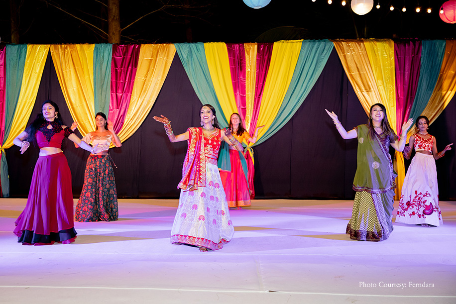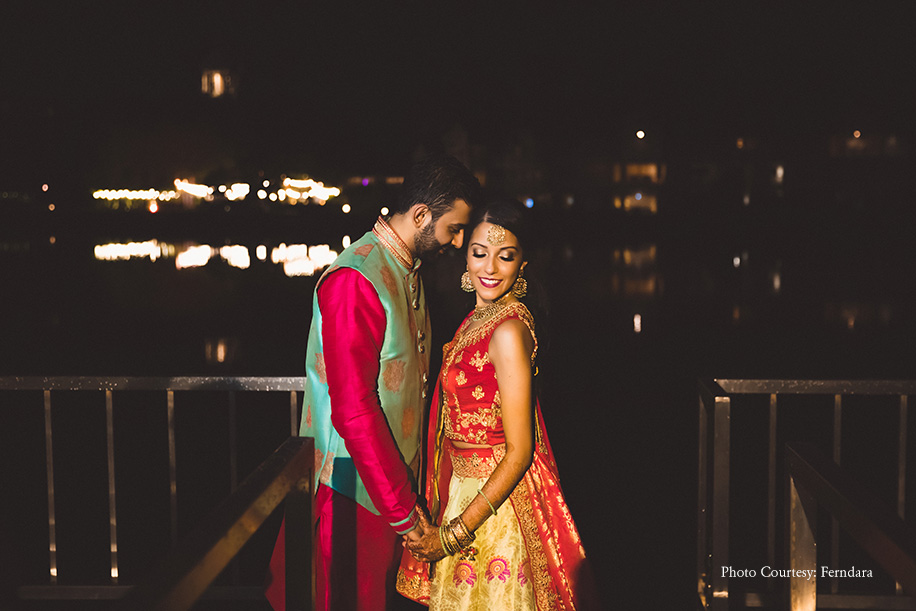 The couple hosted their sangeet in the evening at the Xana Lawn and Lagoon Deck. This was an outdoor setup decorated with lots of colorful elements. Unfortunately, the weather wasn’t in their favour when the forecast went from a 10 percent chance of rain prediction to a 95 percent chance of thunderstorms. The couple, who had always wanted to have an outdoor sangeet, stuck to their plan. Luckily, the event turned out to be incredible with all their guests partying under the deck despite the rain. The DJ too shifted his gear in no time, and everyone danced on the floor. The bride looked pretty in a red and mint green lehenga while the dashing groom picked a hot pink kurta and an aqua blue jacket.