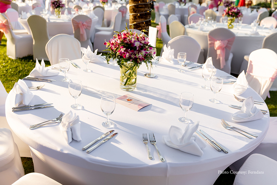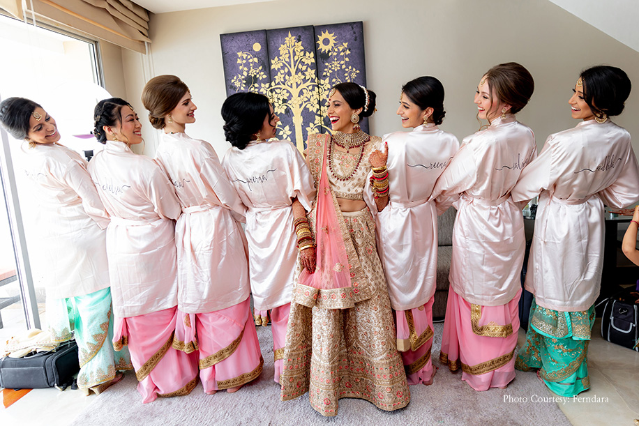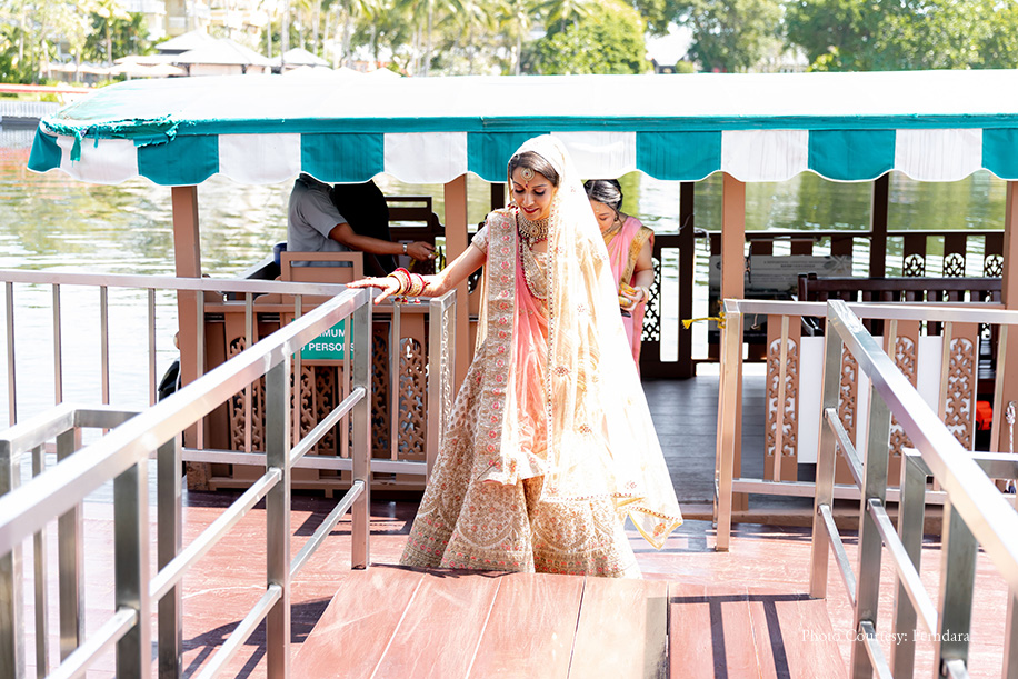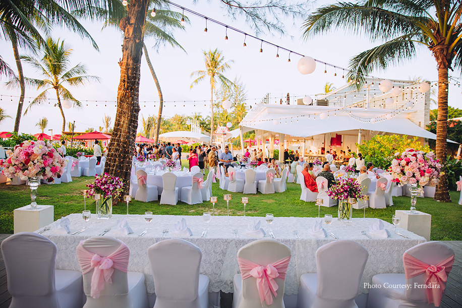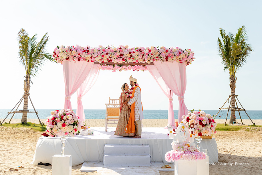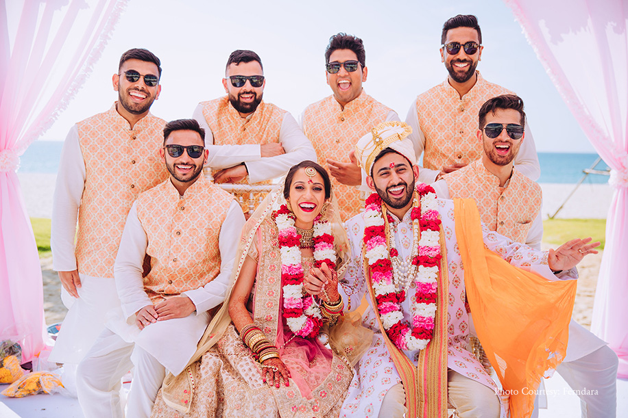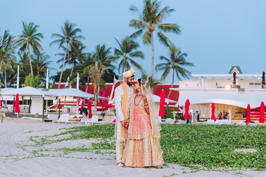 The color scheme of their wedding hosted at Xana Beachfront included pastel pinks and a few punches of brighter colours. Soon after the pheras, the couple and their loved ones headed to the Lagoon Deck for a semi-formal dinner. Raksha and Deepesh made an impressive entry in a boat rowed across the lagoon. She wore an off-white lehenga with a coral dupatta, while he picked a white sherwani with an orange stole. The evening comprised of beautiful speeches, dance performances, and delectable food. After the dinner, they had the formal bridal farewell ceremony, which was extremely emotional. The morning after the wedding was light and fun with the couple and the groom’s family members playing post-wedding games like ‘Find the ring.’