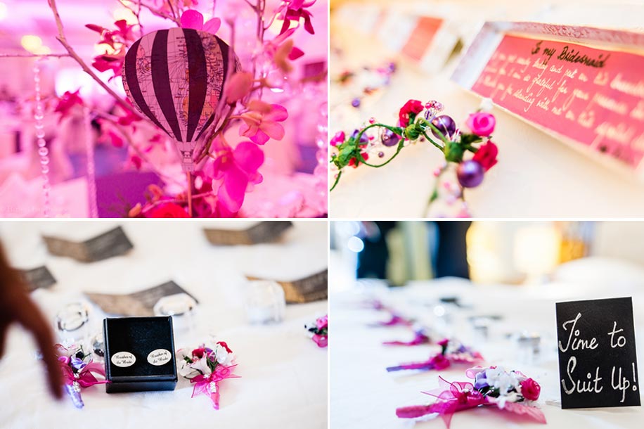 The theme for our Catholic wedding ceremony was wanderlust/travel as Garrie and I love to travel. Not to mention us being from different continents, having met in Dubai and having to keep travelling to meet in the nine months that led up to our wedding. The decor was personalized and I had a few friends help out. My bridesmaids wore three different shades of pink and purple.