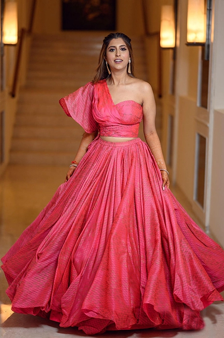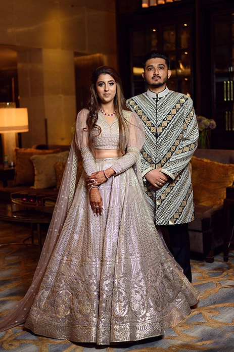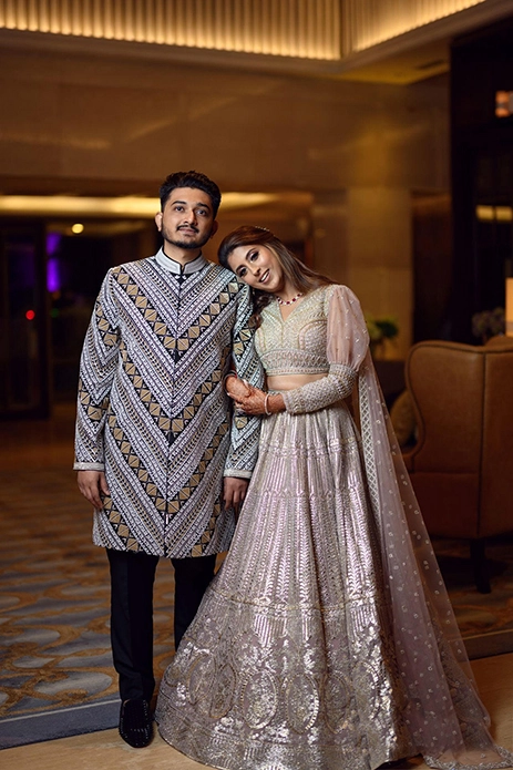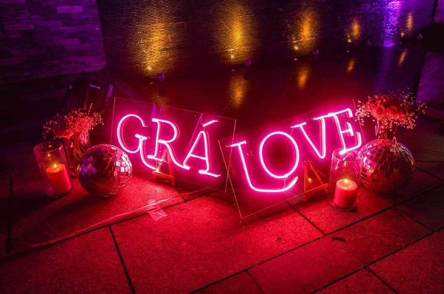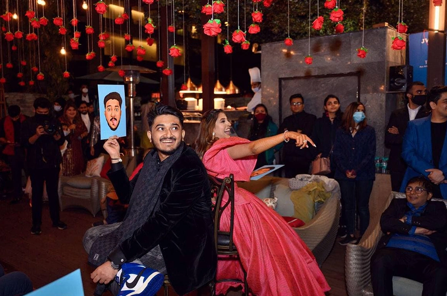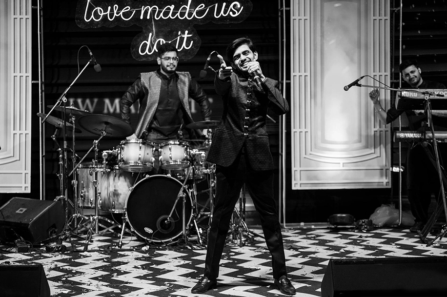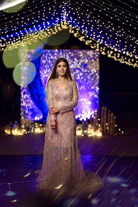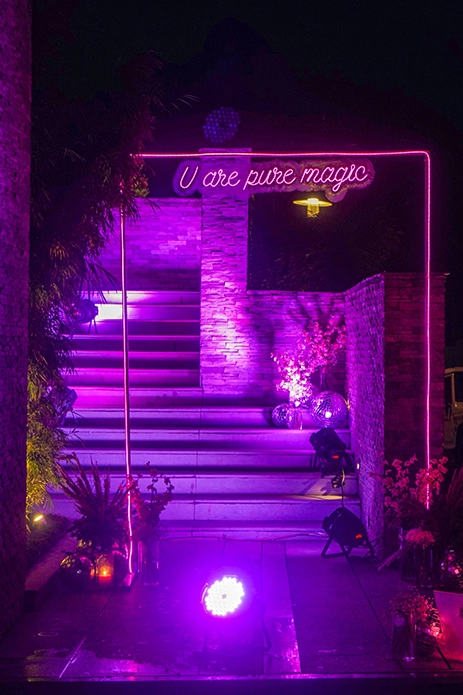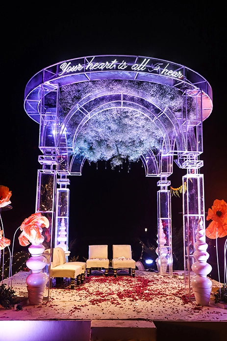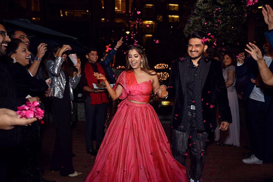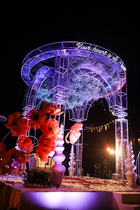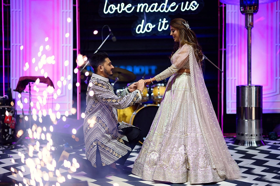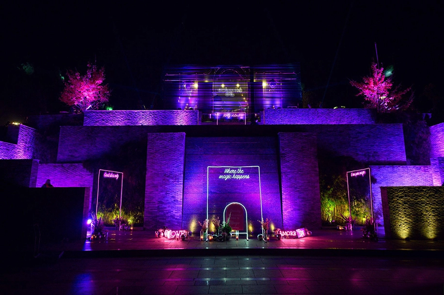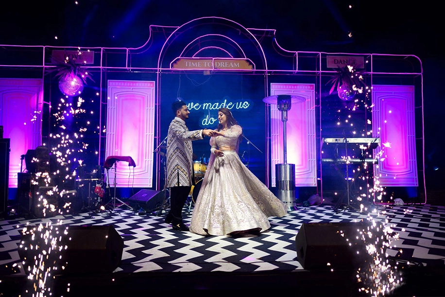 The evening transitioned into retro glam with neon decor, a classic ‘rock-n-roll’ stage and an open amphitheater-style setup. Bright red, pink and purple took over the space, with magical lighting, neon signages, disco balls and more. The couple and their loved ones spent the evening performing dazzling dance numbers. The bride squad dedicated trendy Instagram dances to the bride receiving great applause before singer Stebin Ben took over the mike and awed the audience with his melodious tunes.