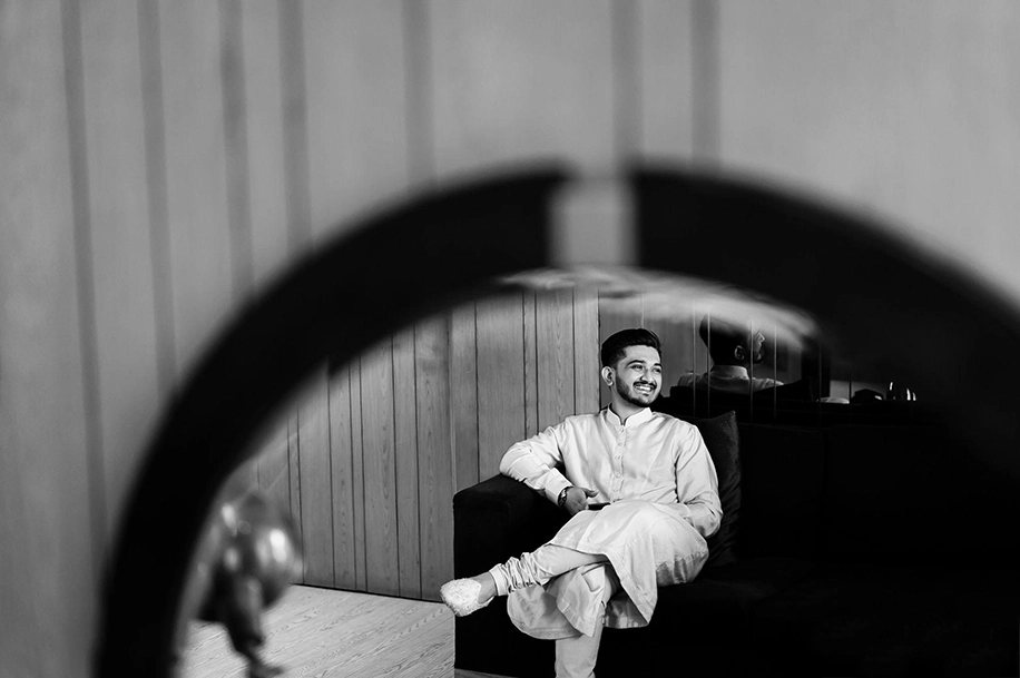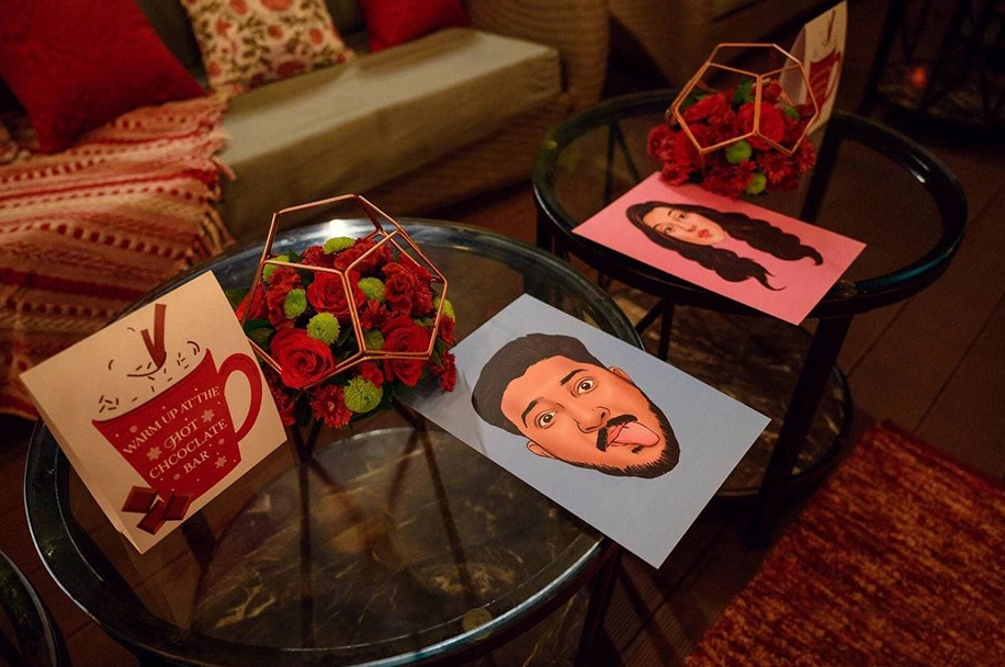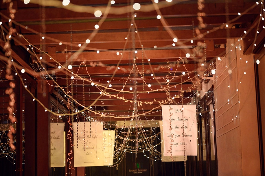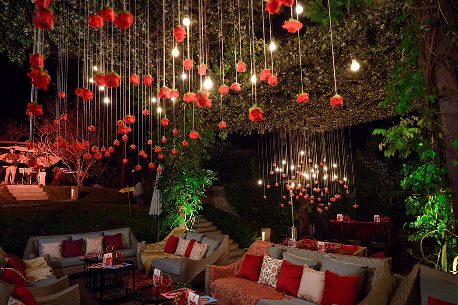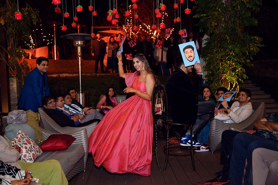 Imbued with vintage romance, the Welcome Dinner was adorned with red roses and soft amber lighting for a warm evening of celebrations. Marshmallows, hot cocoa and cozy sofas set a charming wintry ambience where everyone could relax and enjoy a night of games, music and mingling to kickstart the wedding festivities. The bride and groom matched the vibe of the evening in rose pink and black as they entered amidst a shower of rose petals.