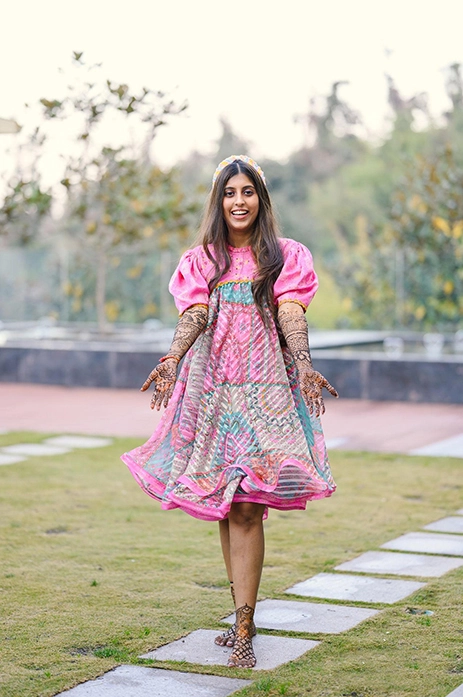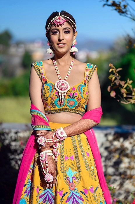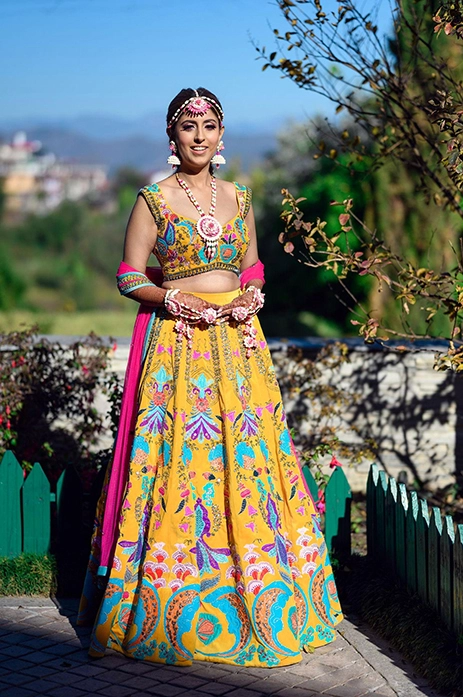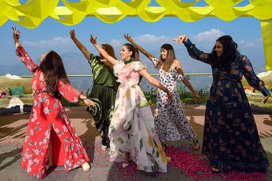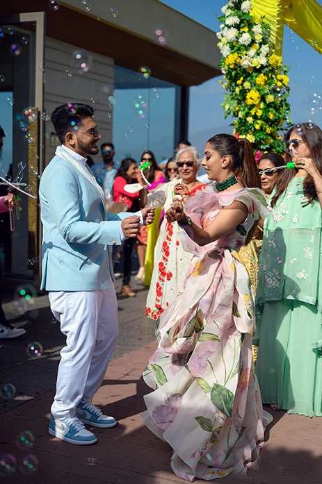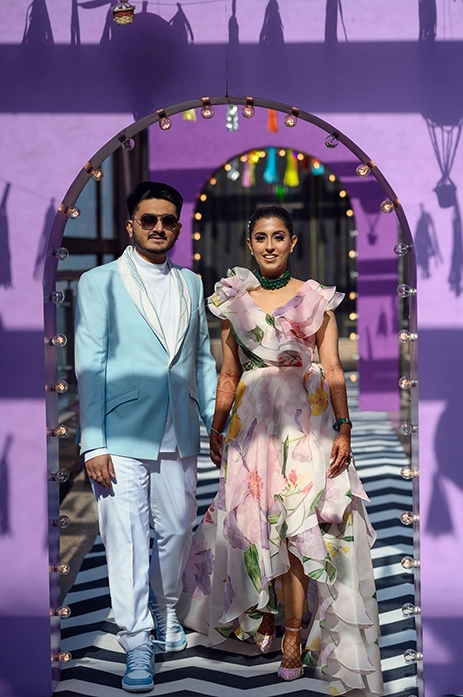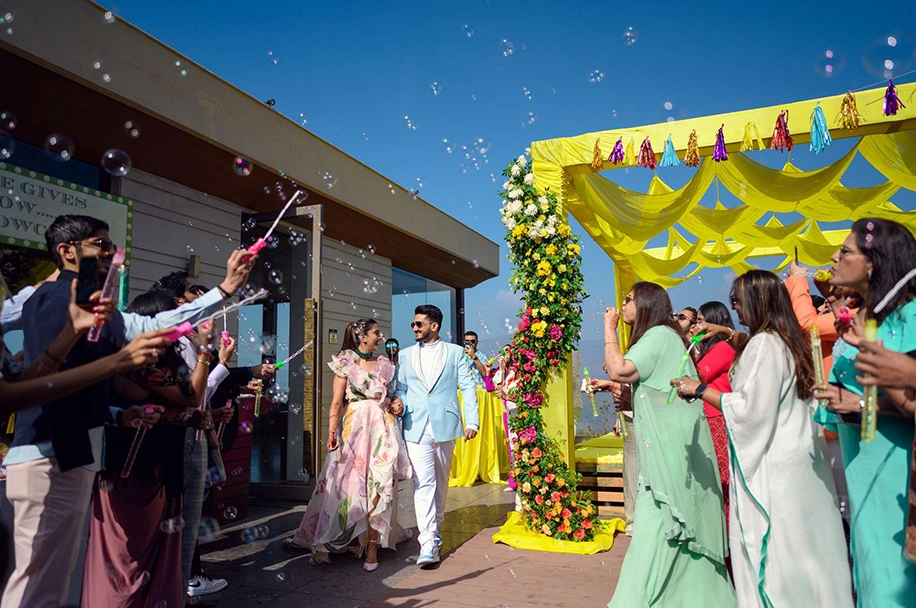 The highly creative and quirky decor in bright hues of yellow and purple painted a vibrant picture against the mountain vistas for the Mehndi function. Bright blooms, crisscrossing overhead lines of tassels and unique table arrangements, all added to the lively vibe as everyone geared up to enjoy a morning of mehndi, games and music. The bride stole hearts in a gorgeous floral dress, while the groom looked breezy as can be in sky-blue as they waltzed in amidst a shower of bubbles.