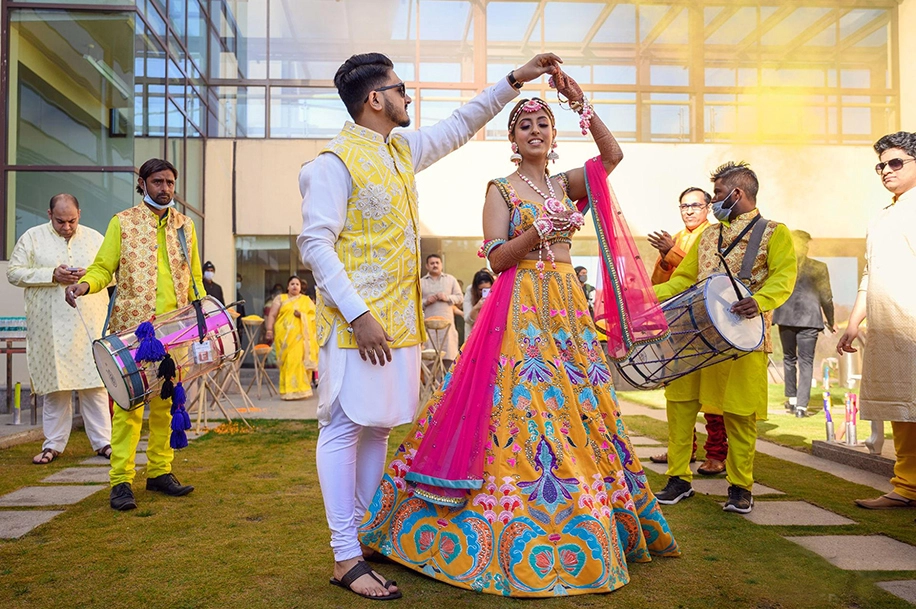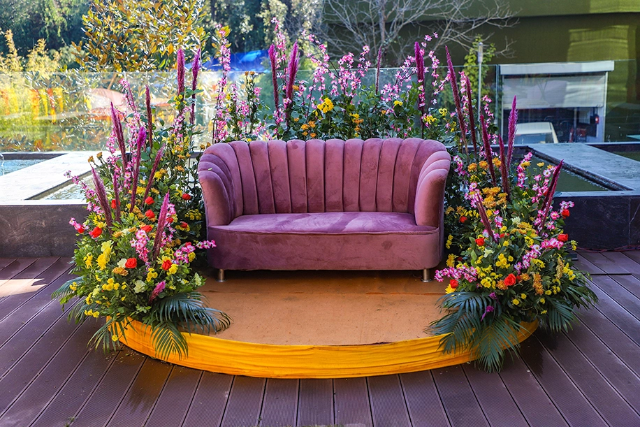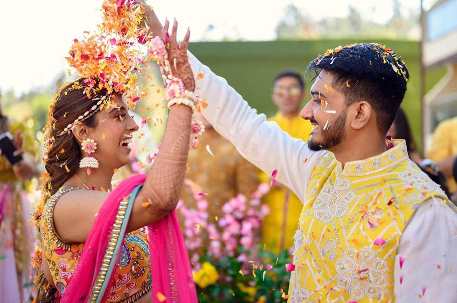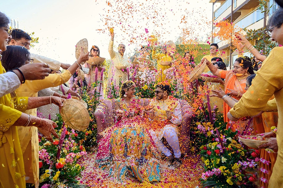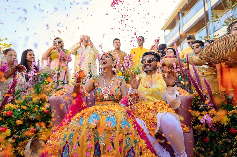 The final day began with a Haldi ceremony at the venue’s stunning courtyard in true Marwari fashion with marigolds, Dhol beats and lively revelries. Platters and arrangements of yellow and orange marigolds adorned the space with pops of brightness, while the couple seating was a unique setup with a plush sofa nestled in a cluster of greens and blooms. The couple arrived with great pomp and splendor amidst a puff of Holi colors and music before heading to the Haldi ritual, where they were showered with flower petals.