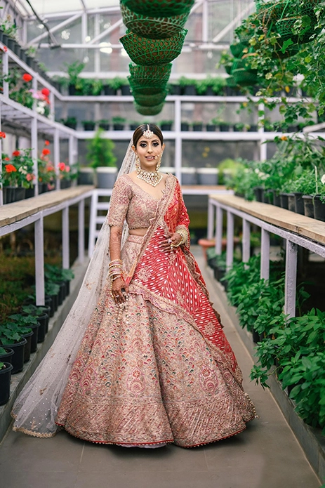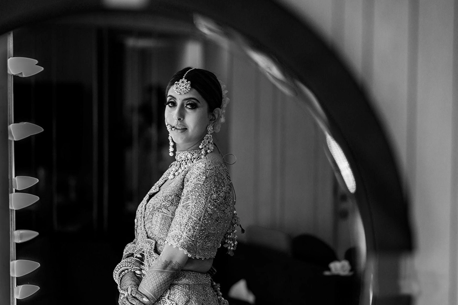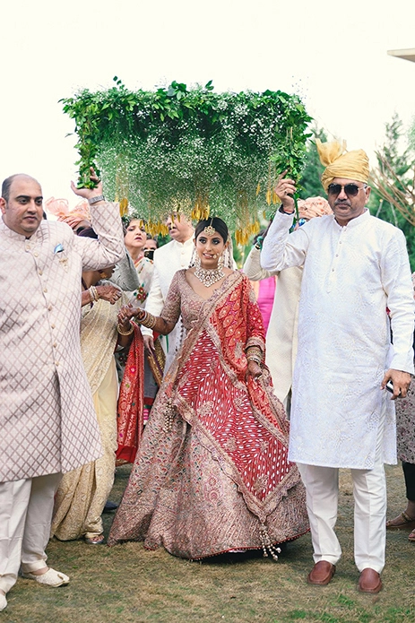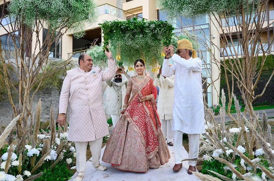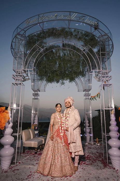 Crafted with impressive floral decor in hues of white, the wedding ceremony was an ethereal sight to see! Plush arrangements of baby’s breath and foliage filled the space with an air of tranquility, perfectly complimenting the surrounding lush mountain views, while splashes of burnt orange, the groom’s favorite color, added warmth to the setting. The bride entered under a phoolon ki chadar made of baby’s breath while the groom arrived in a vintage car accompanied by his exuberant baraat. The couple exchanged their varmalas under a breathtaking setup of flowers and chandeliers that hung from the tree. The mandap saw a chic transparent crystal structure with a canopy of baby’s breath. Flanked by orange 3D peonies , it looked divine against the mountains beyond.