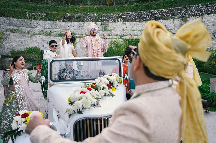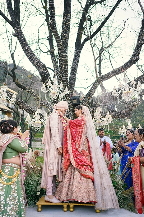Crafted with impressive floral decor in hues of white, the wedding ceremony was an ethereal sight to see! Plush arrangements of baby’s breath and foliage filled the space with an air of tranquility, perfectly complimenting the surrounding lush mountain views. The bride entered under a phoolon ki chadar made of baby’s breath while the groom arrived in a vintage car accompanied by his exuberant baraat. The couple exchanged their varmalas under a breathtaking setup of flowers and chandeliers that hung from the tree. The mandap saw a chic transparent crystal structure with a canopy of baby’s breath. Flanked by 3D cosmos flowers in bright orange, it looked divine against the mountains beyond.