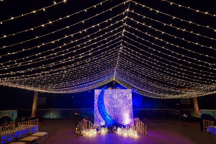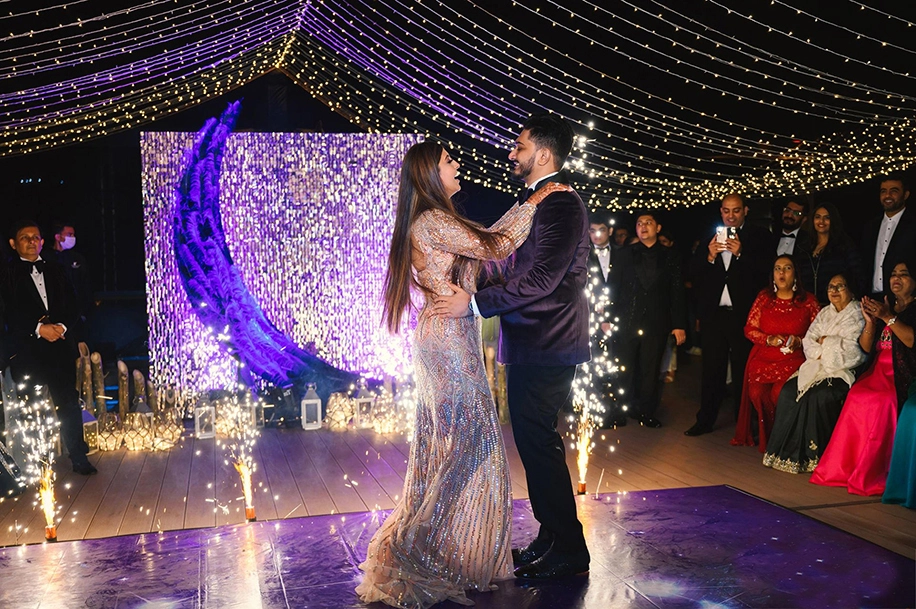 The festivities came to an end with a fairytale reception under the stars. A dreamy canopy of string lights, glittering decor elements, a mesmerizing dancefloor with a stunning crescent moon backdrop, and more. The evening was full of emotions and love, brimming with special moments that the couple shared with their family and friends such as the groom’s dance with his mother and the bride’s dance with her father before taking the stage together as husband and wife.