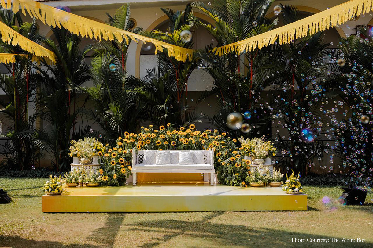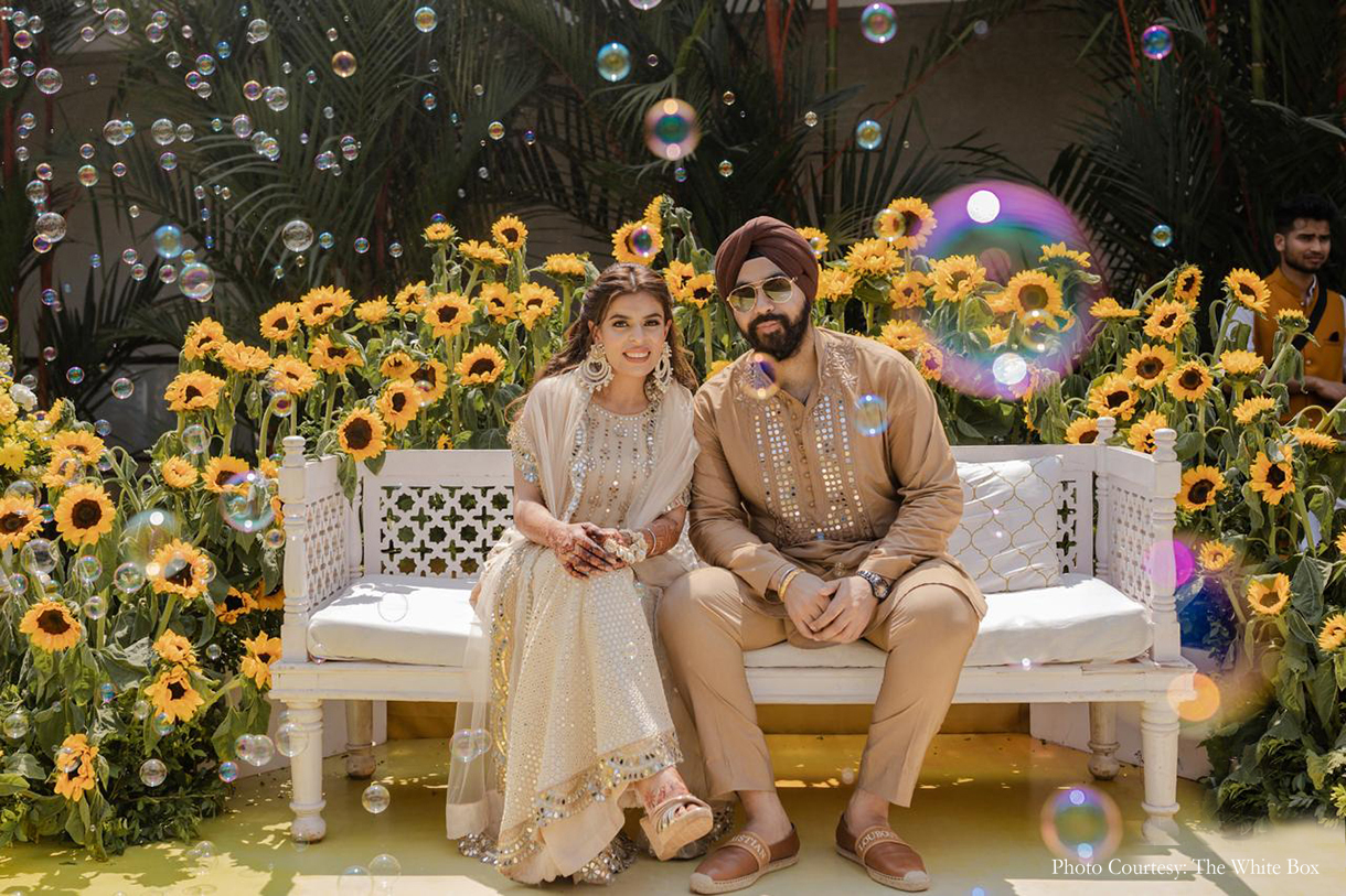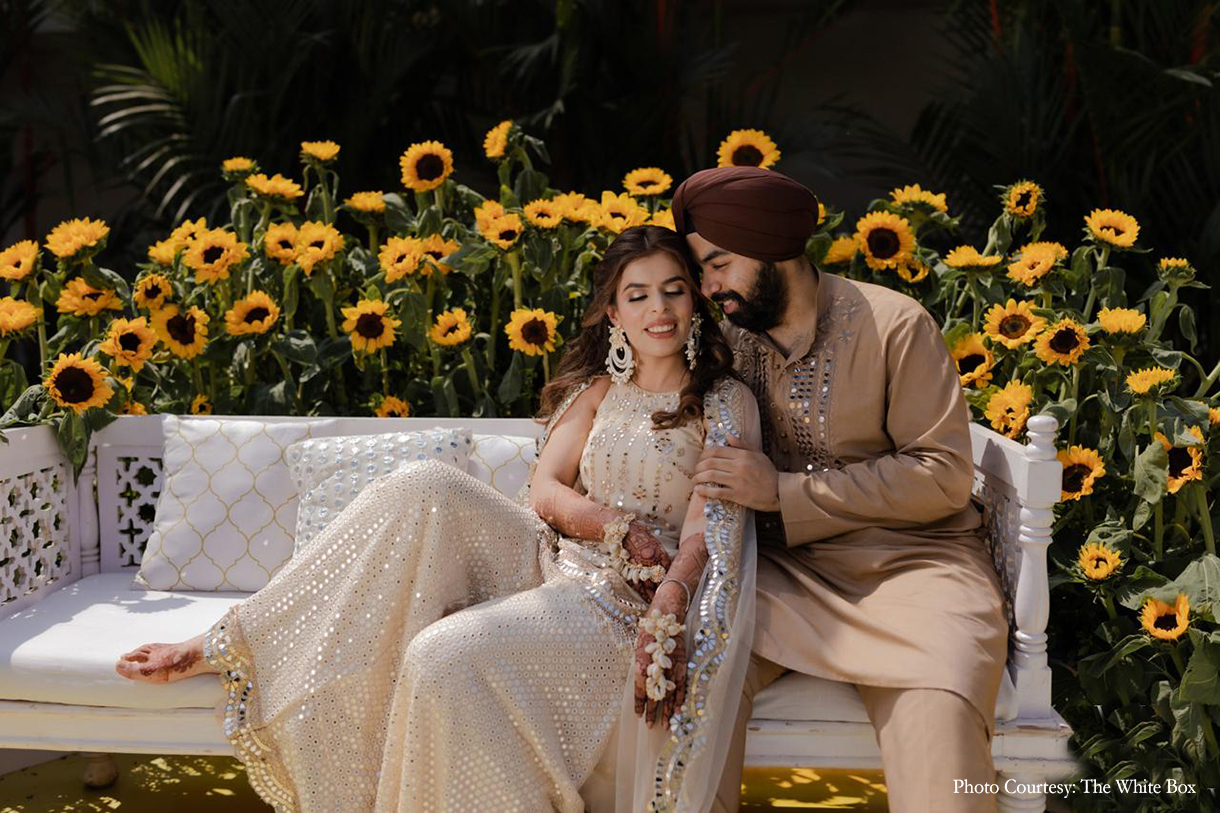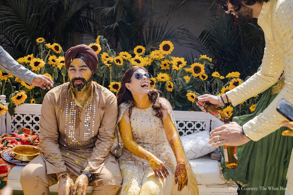 Taking the traditional route, the sunlit haldi celebration was swathed in hues of yellow. Sunflowers, ivory furnishings and foliage gave the venue a cheery look. The couple had a gala time as they danced to the beats of the dhol and their loved ones slathered them with turmeric.