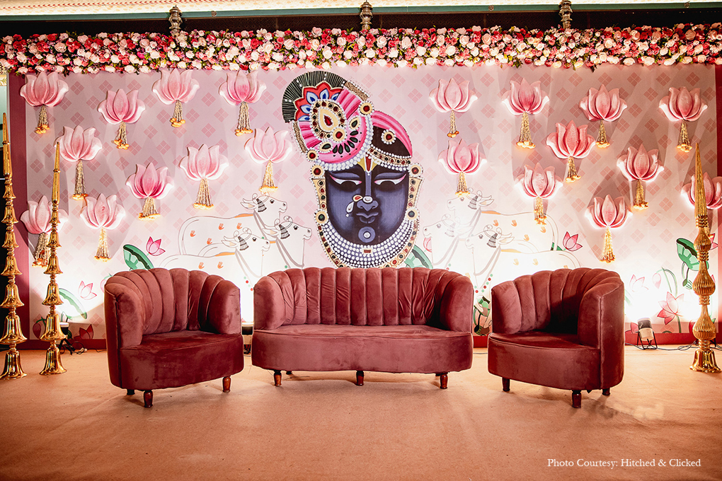 Aakash shares, “The bhaat function and the traditional myra ceremony for the bride and groom’s side were hosted at the respective hotels they were staying in. Both events had a similar pichwai theme with Lord Shreenathji in different avatars surrounded by lotus blooms.”