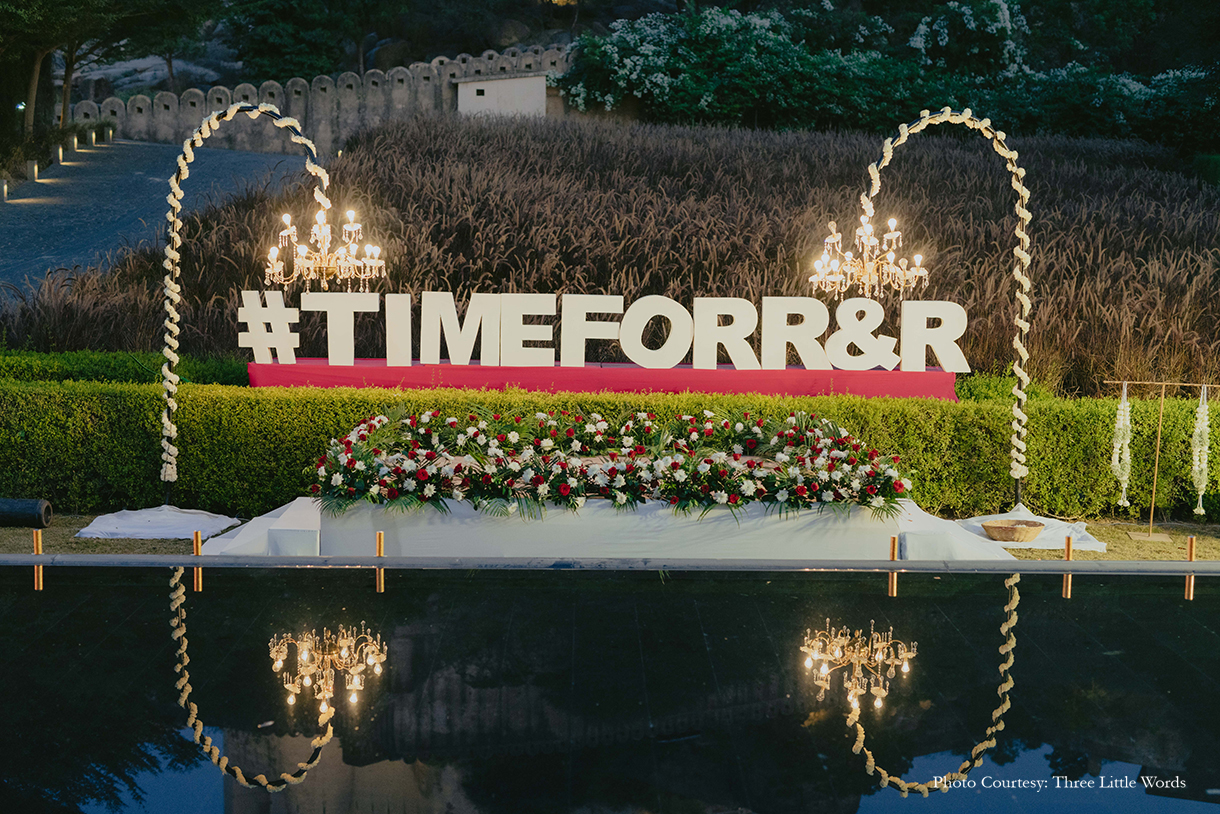 As the sun dipped below the horizon, Ryan’s baraat made its way from the ramparts of the fort to the historic baori stepwell. A majestic tree with its widely spread branches acting as a natural canopy, the wedding mandap exuded a sense of warmth and elegance with the fort’s architecture in the background. The celebrations concluded with an elegant, English-style sit-down farewell dinner. The couple’s beloved fur babies were also part of the festivities, adding to the warmth and charm of this two-day extravaganza.