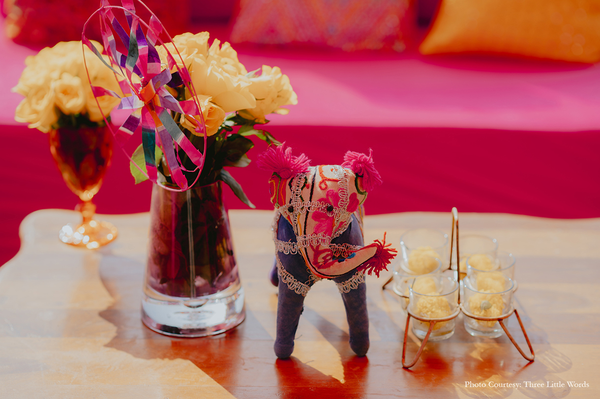 Swathed in hues of fushia, the mehndi decor was a striking contrast against the lushness of the garden venue. Whimsical dream catchers swayed to the breeze while the colorful dancefloor with ethnic prints added a pop of contrasting colors. Upturned parasols and traditional can chairs integrated the cultural nuances of Rajasthan.